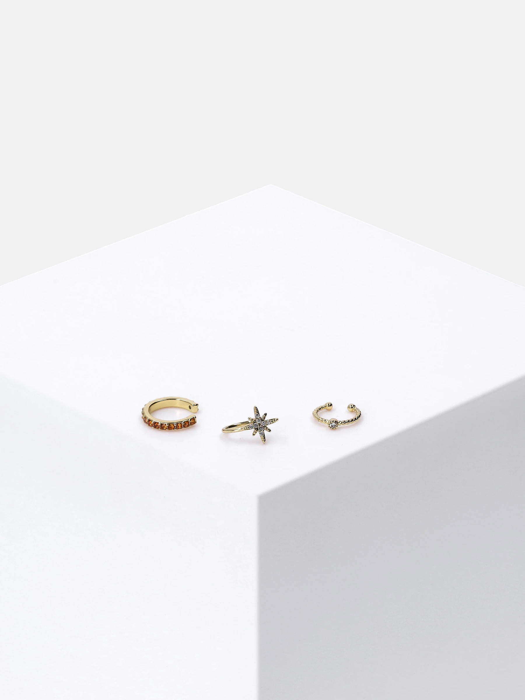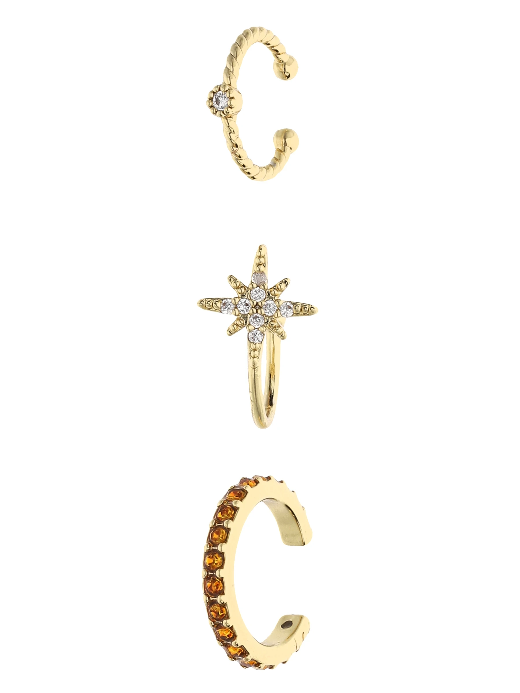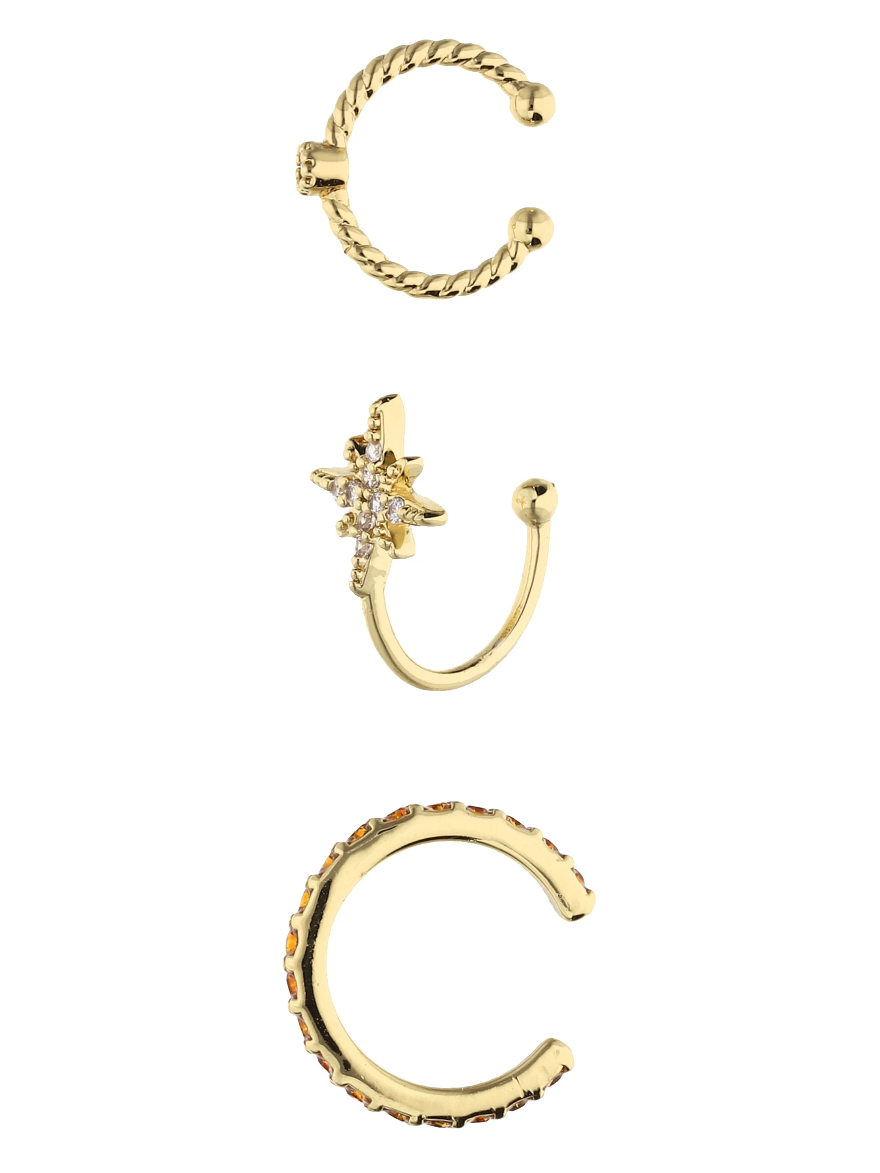 Mix & Match: Glänzendes Earcandy-Set aus 3 Earcuffs mit funkelnden Strasssteinen und winterlichen Nordstern-Motiv. Der Ohrschmuck kann sowohl einzeln als auch in Kombination getragen werden und eignet sich hervorragend als Geschenk. Durch seine hochwertige Vergoldung bekommt der Ohrschmuck den letzten Schliff verpasst.