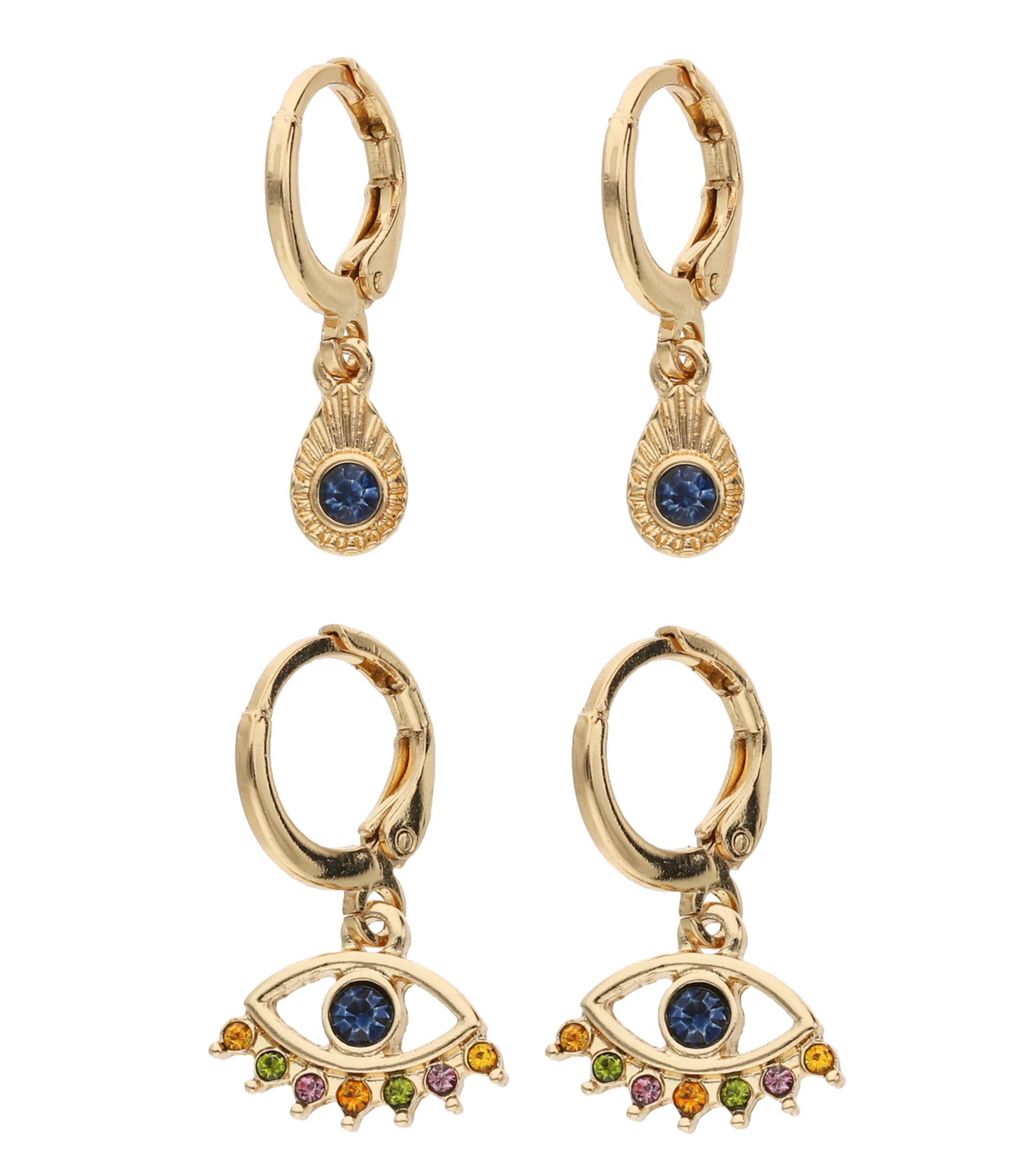 Diese Huggie-Creolen sind echte Eyecatcher! Modische Augen-Motive und bunte Strasssteine runden die Schmuckstücke raffiniert ab und kreieren einen höchst modischen Look, der sich vielfältig kombinieren lässt. Mix & Match: Egal ob einzeln oder im Ear-Candy-Look – hiermit ziehst du garantiert sämtliche Blicke auf dich!