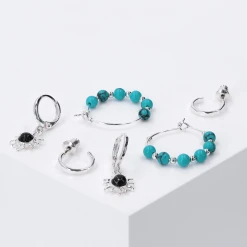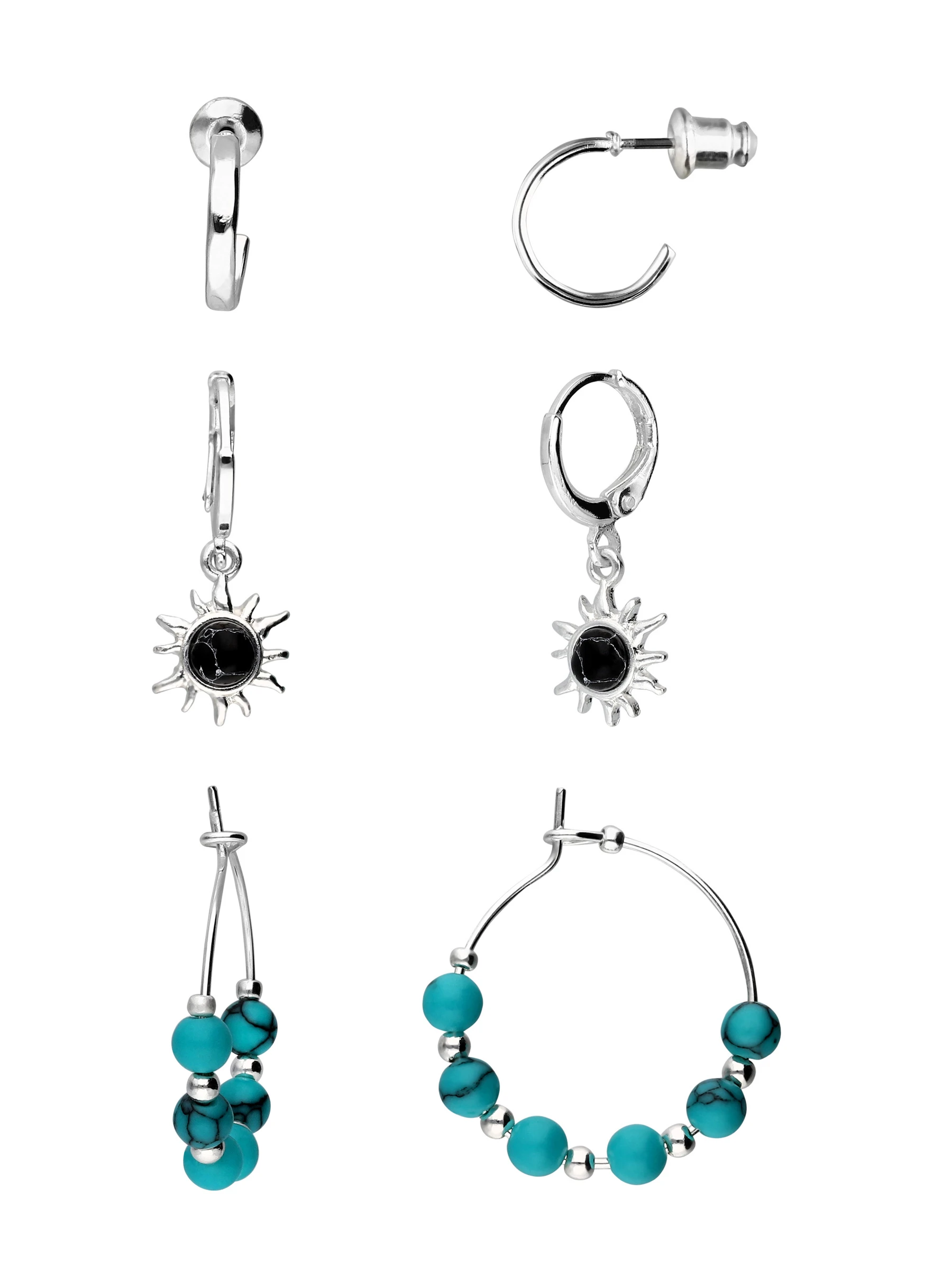 Mix & Match: Trage die Pieces einzeln oder kombiniere sie miteinander und kreiere einen tollen Earcandy-Look. Das Set besteht aus Creolen, Huggie-Creolen und modischen Ohrhängern. Verziert mit Sonnen-Motiven und Howlith-Schmucksteinen wird der Schmuck zum echten Eyecatcher! Ideal auch als Geschenk.