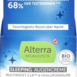Die Alterra Sleeping Augencreme ist eine reichhaltige Nachtpflege zur Regeneration der empfindlichen Augenpartie über Nacht mit nachweislich feuchtigkeitsspendender Wirkung**. Multimoist CLR™ versorgt die Haut sofort und langanhaltend mit Feuchtigkeit und glättet sie. Bei regelmäßiger Anwendung werden Trockenheitsfältchen gemildert, die Haut erscheint glatter und weicher***. Vitamin E hilft der Haut, sich besser vor negativen, oxidativen Umwelteinflüssen zu schützen.