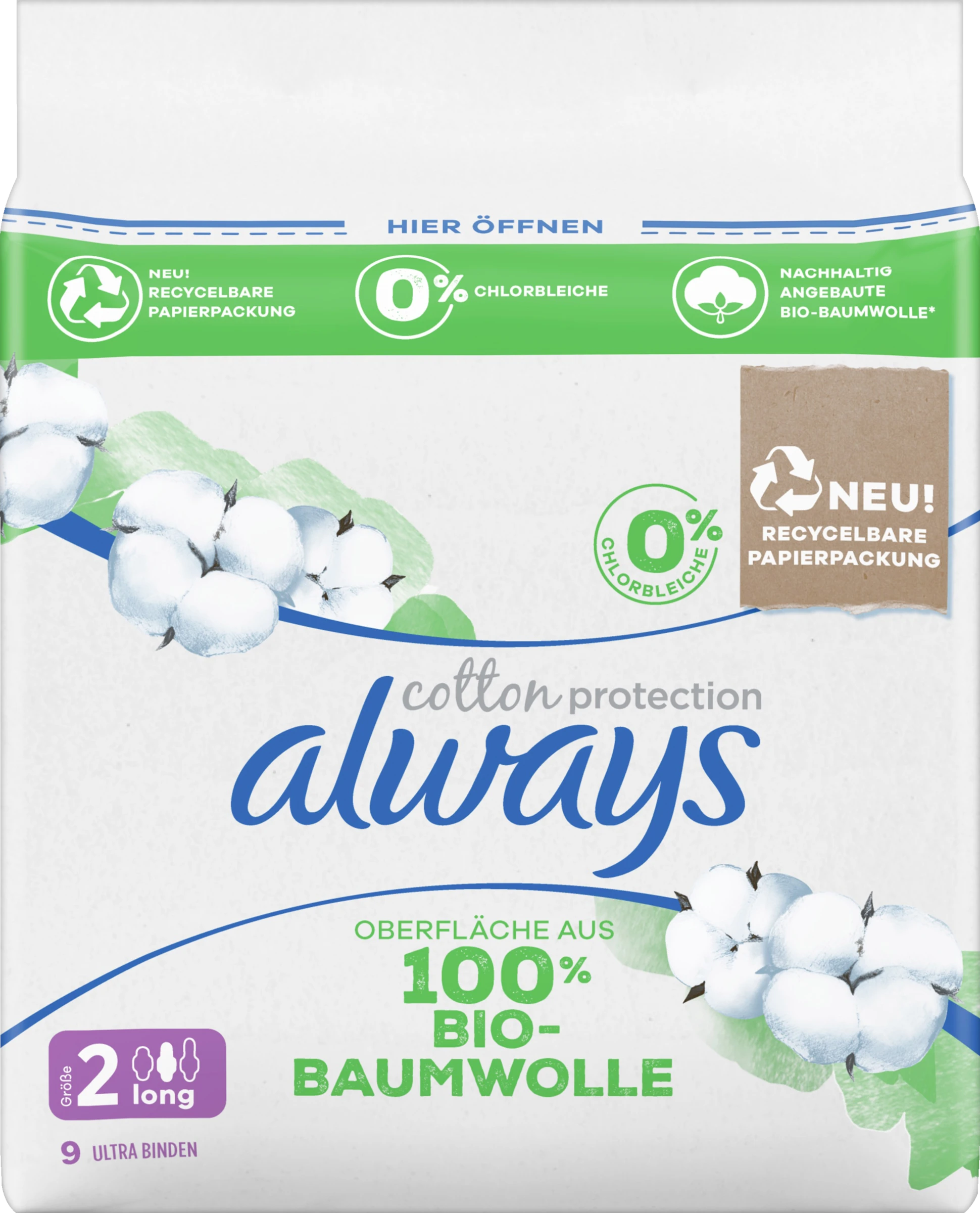 Die Oberfläche der Always Ultra Cotton Protection Binden besteht aus 100 % Bio-Baumwolle. Always Ultra Cotton Protection Binden enthalten weder Duft- noch Farbstoffe und sind ohne Chlor gebleicht. Zudem wurden sie von Dermatologen der Skin Health Alliance bestätigt und von Cotton Inc. zertifiziert. Sie haben ein die Flüssigkeit einschließendes Gel, und Gel kann nicht auslaufen. Always mit Baumwollschutz Lang ist geeignet für leichte Tage bei Slipgröße L, für mittelstarke Tage bei Slipgröße M und L und für starke Tage bei Slipgröße S.