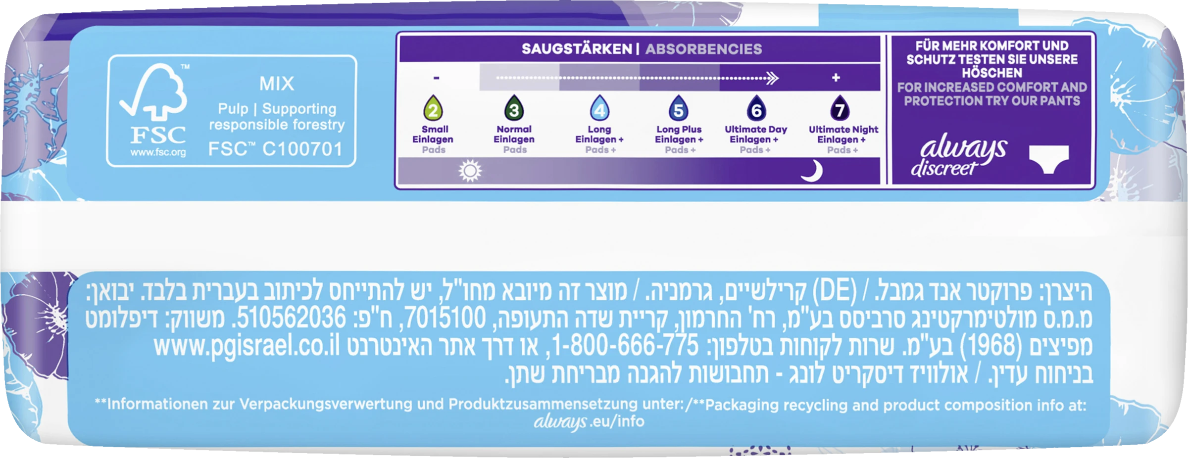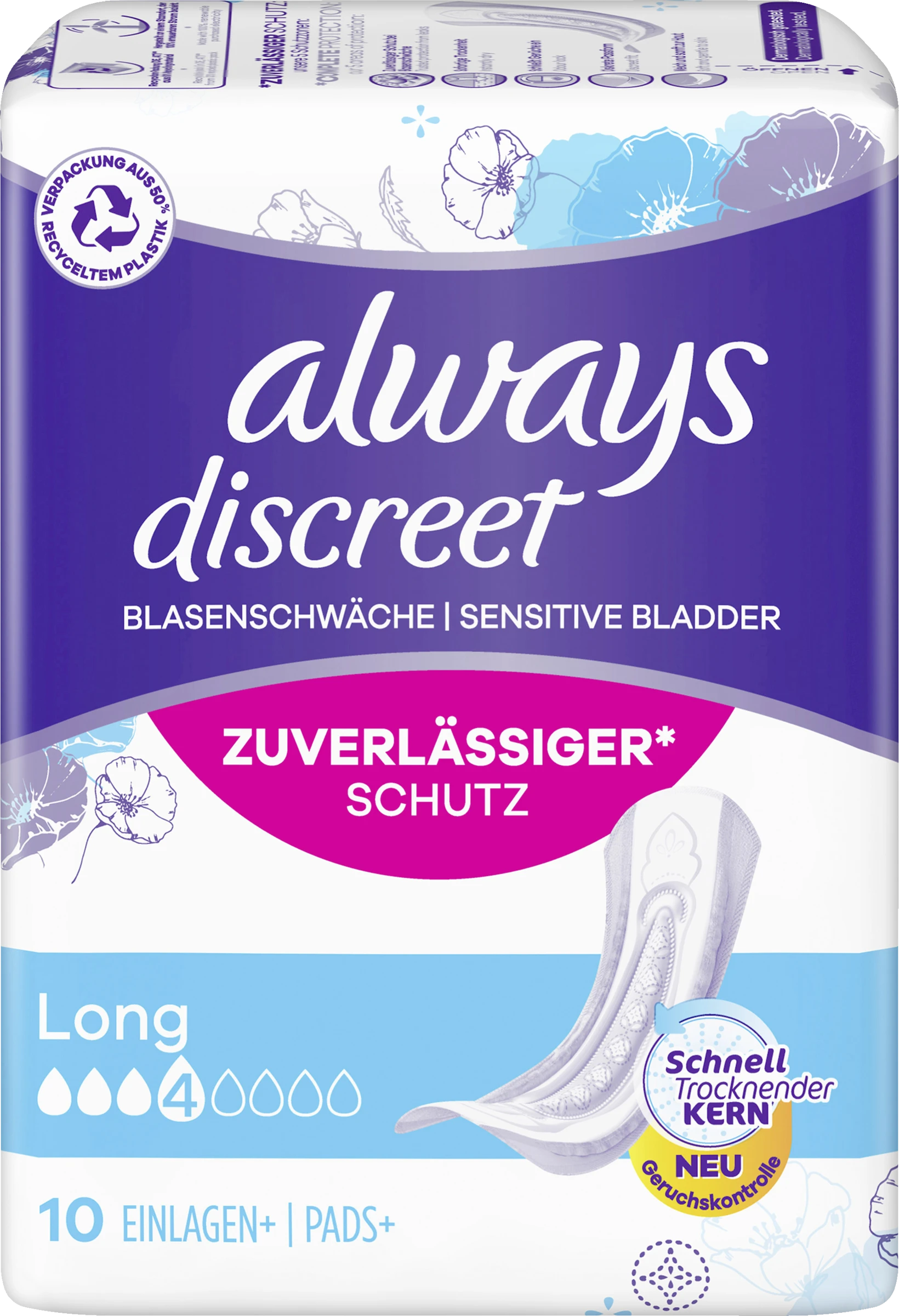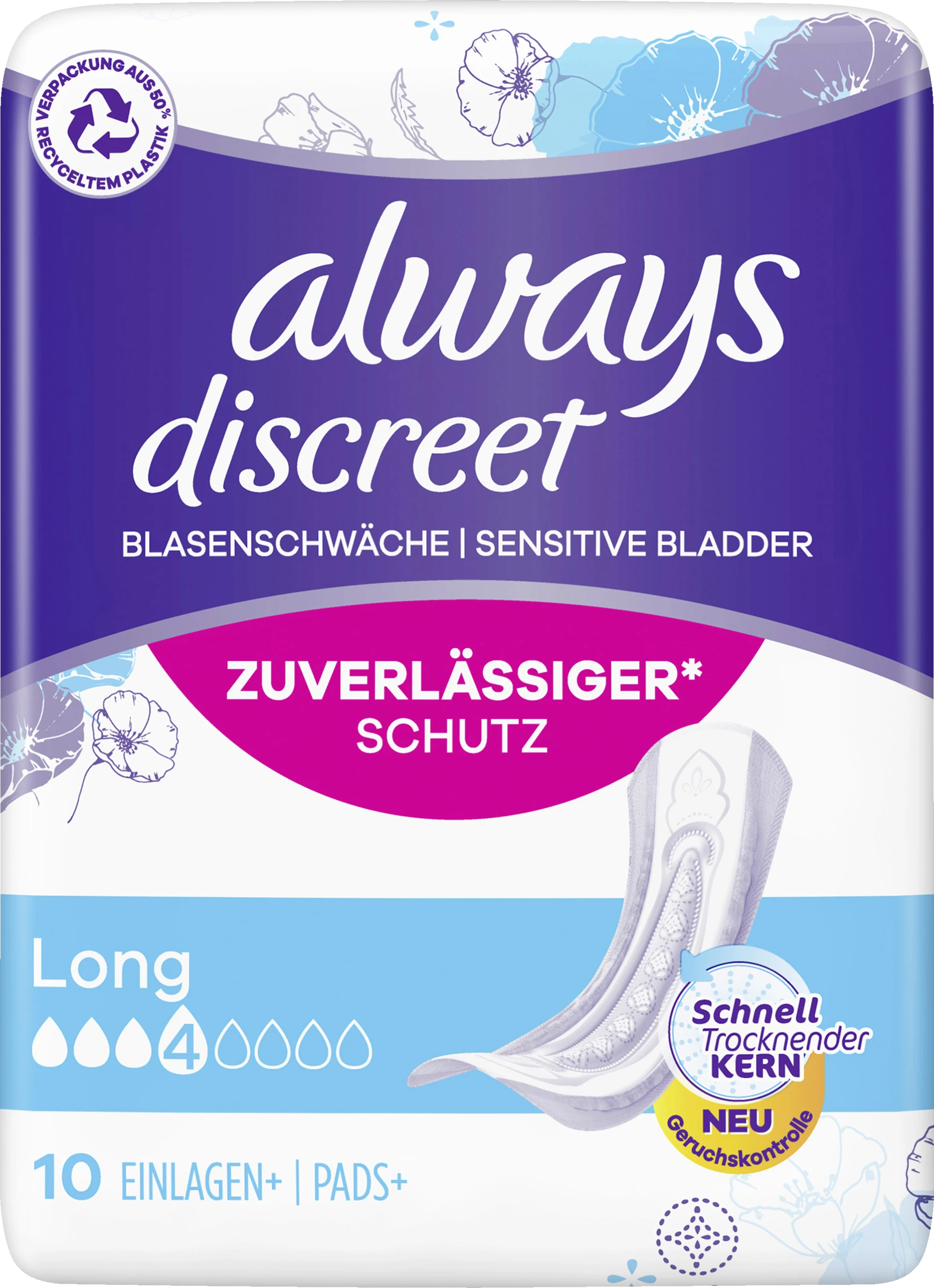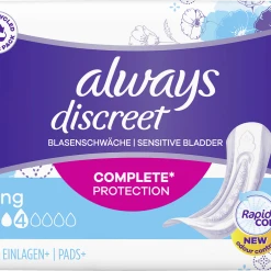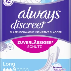 Die Always Discreet Inkontinenzeinlagen Long bieten Ihnen Rundumschutz und eine diskrete Passform. Jede Einlage ist so konzipiert, dass sie zuverlässigen Schutz vor Auslaufen,Geruchskontrolle, sofortiges Trocknen und ein weiches, sanftes Gefühl auf der Haut bietet, während sie sich diskret an Ihren Körper anpasst. Wenn Niesen oder Lachen zu Blasenschwäche führt, bieten die Always Discreet Einlagen Long einen starken Schutz und die gewünschte Diskretion, damit Sie sich sicher fühlen können.