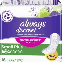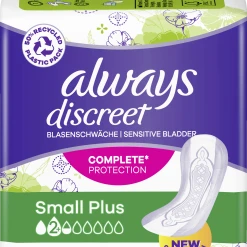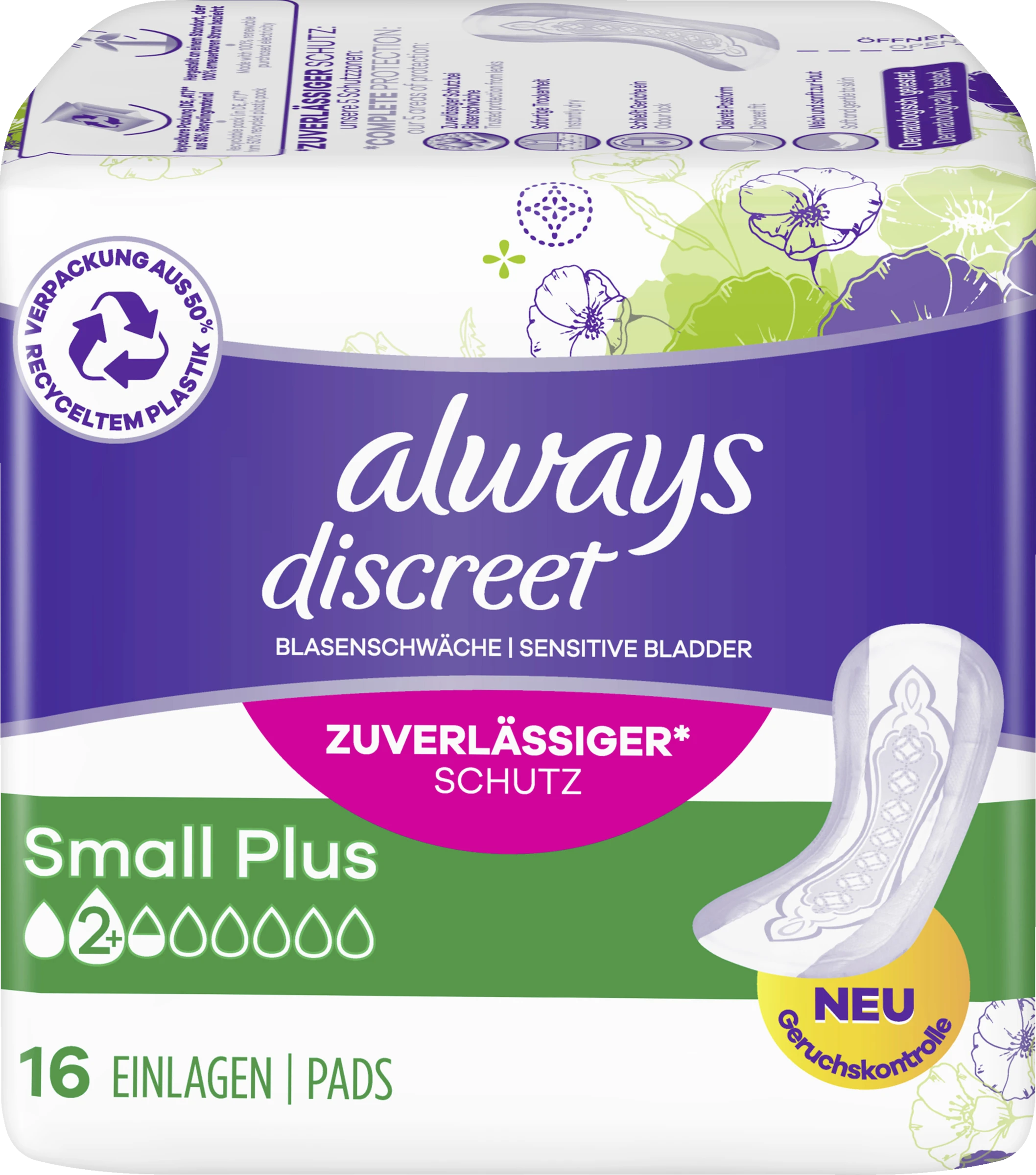 Die Always Discreet Inkontinenzeinlagen Small bieten Ihnen Rundumschutz und eine diskrete Passform. Jede Einlage ist so konzipiert, dass sie zuverlässigen Schutz vor Auslaufen, Geruchskontrolle, sofortiges Trocknen und ein weiches, sanftes Gefühl auf der Haut bietet, während sie sich diskret an Ihren Körper anpasst. Wenn Niesen oder Lachen zu Blasenschwäche führt, bieten die Always Discreet Einlagen Small einen starken Schutz und die gewünschte Diskretion, damit Sie sich sicher fühlen können.