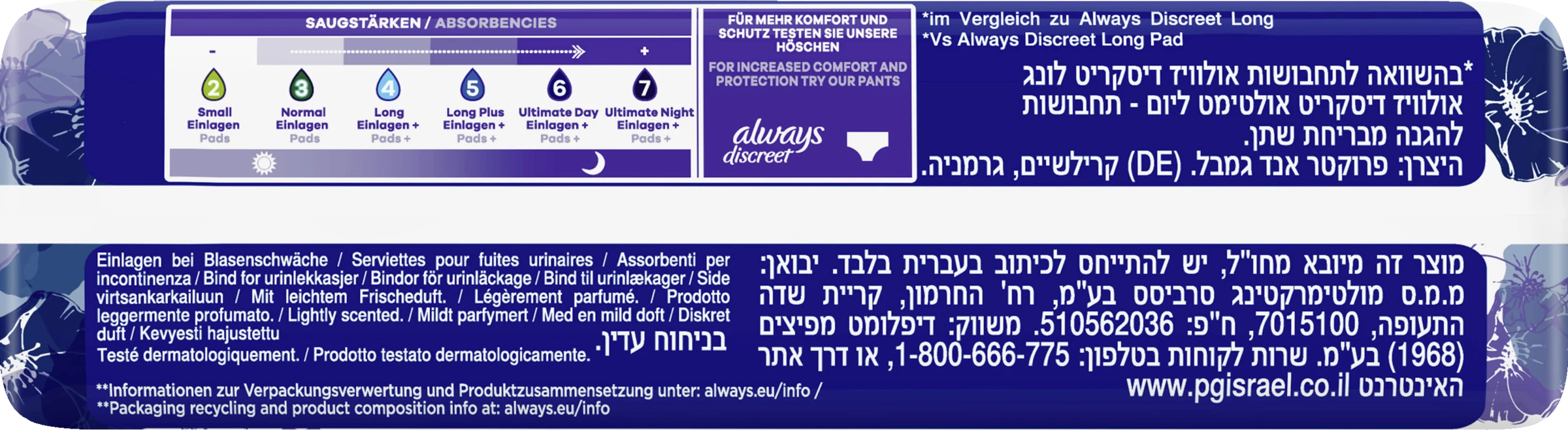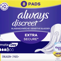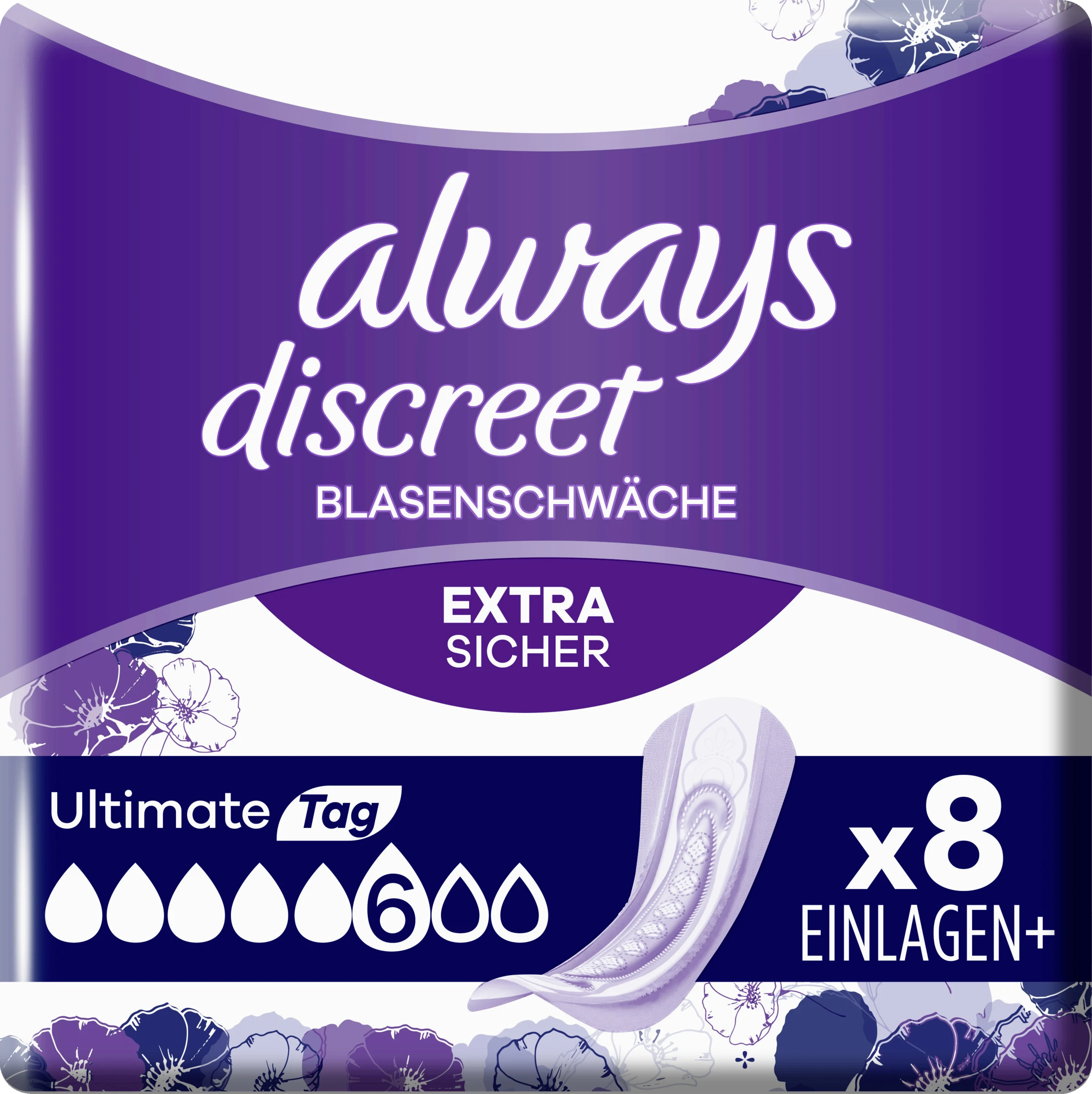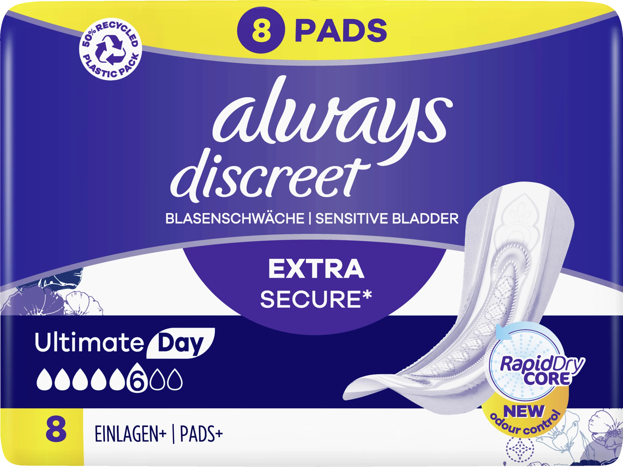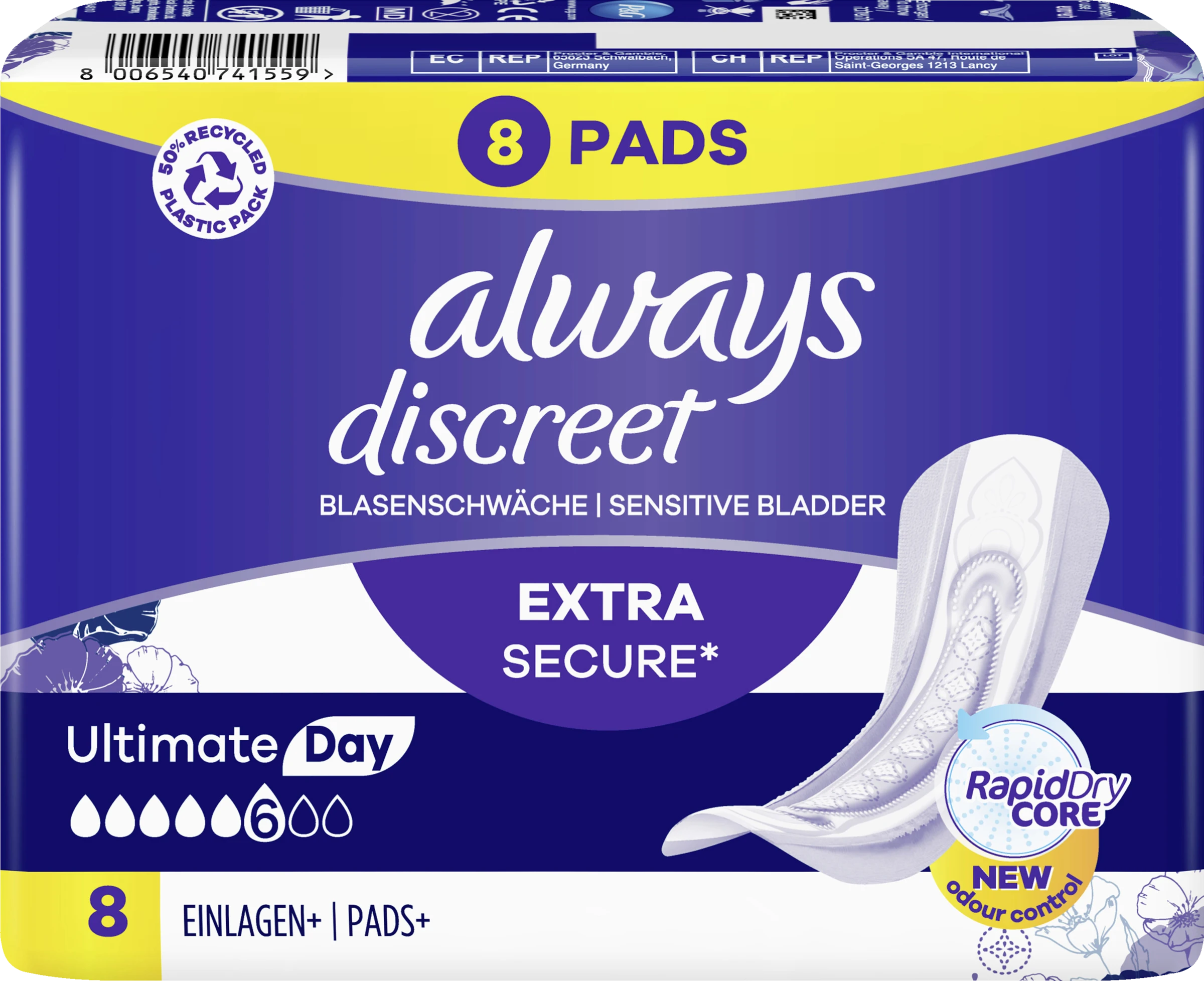 Extra lang und saugfähig fĂĽr extra Schutz – Always Discreet Inkontinenz-Einlagen Ultimate Tag sind besonders sicher und kaum spĂĽrbar. Sie wurden entwickelt, um Ihnen zusätzlichen Komfort und Saugfähigkeit zu bieten, damit Sie sich keine Sorgen mehr machen mĂĽssen. Ihre Struktur ermöglicht starken Schutz mit einem ultra-dĂĽnnen Kern, sodass Sie keine Kompromisse zwischen Komfort und Schutz eingehen mĂĽssen. Wenn Niesen oder Lachen Blasenschwäche verursacht, bieten die Always Discreet Einlagen Ultimate Tag optimalen Schutz.