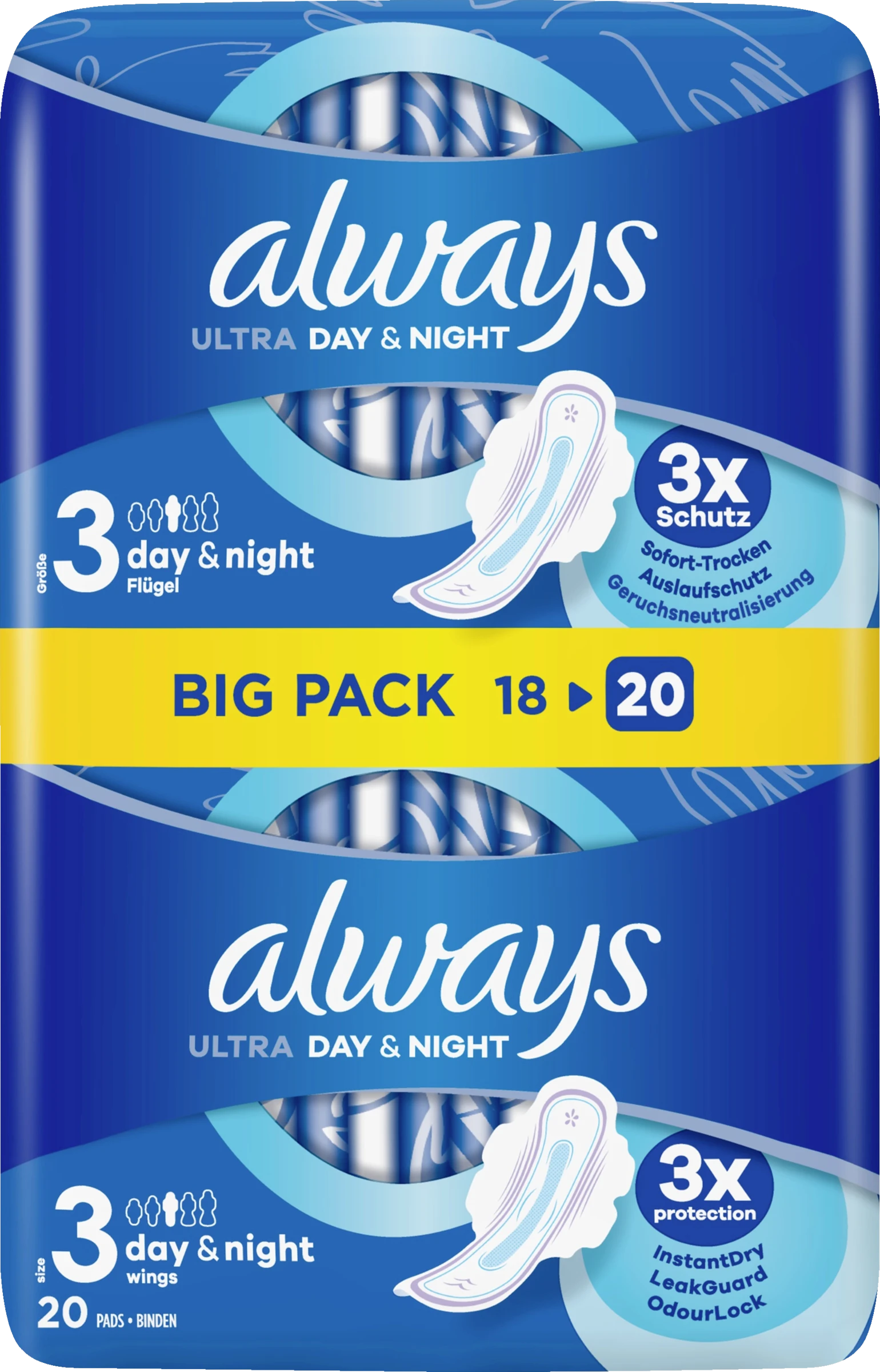 Geben Sie sich mit nicht weniger als 3-fachem Schutz zufrieden: ALWAYS Ultra Day & Night (Größe 3) Damenbinden mit Flügeln verwenden die neueste Technologie, um eine multifunktionale Binde mit 3 Schutzfunktionen für Schutz bei Tag und Nacht zu bieten. Das InstantDry-System absorbiert Flüssigkeit in Sekunden und hält Feuchtigkeit von der Haut fern. LeakGuards schließen die Flüssigkeit ein und verhindert das Auslaufen. Die OdourLock-Technologie neutralisiert Gerüche, sodass Sie sich während Ihrer Periode frisch und sauber fühlen. Mit ALWAYS Ultra fühlen Sie sich gut geschützt und können selbstbewusst durch den Tag gehen. Holen Sie sich den 3-fachen Schutz von Always!