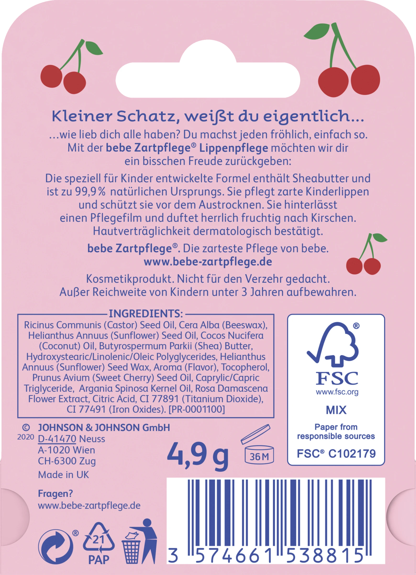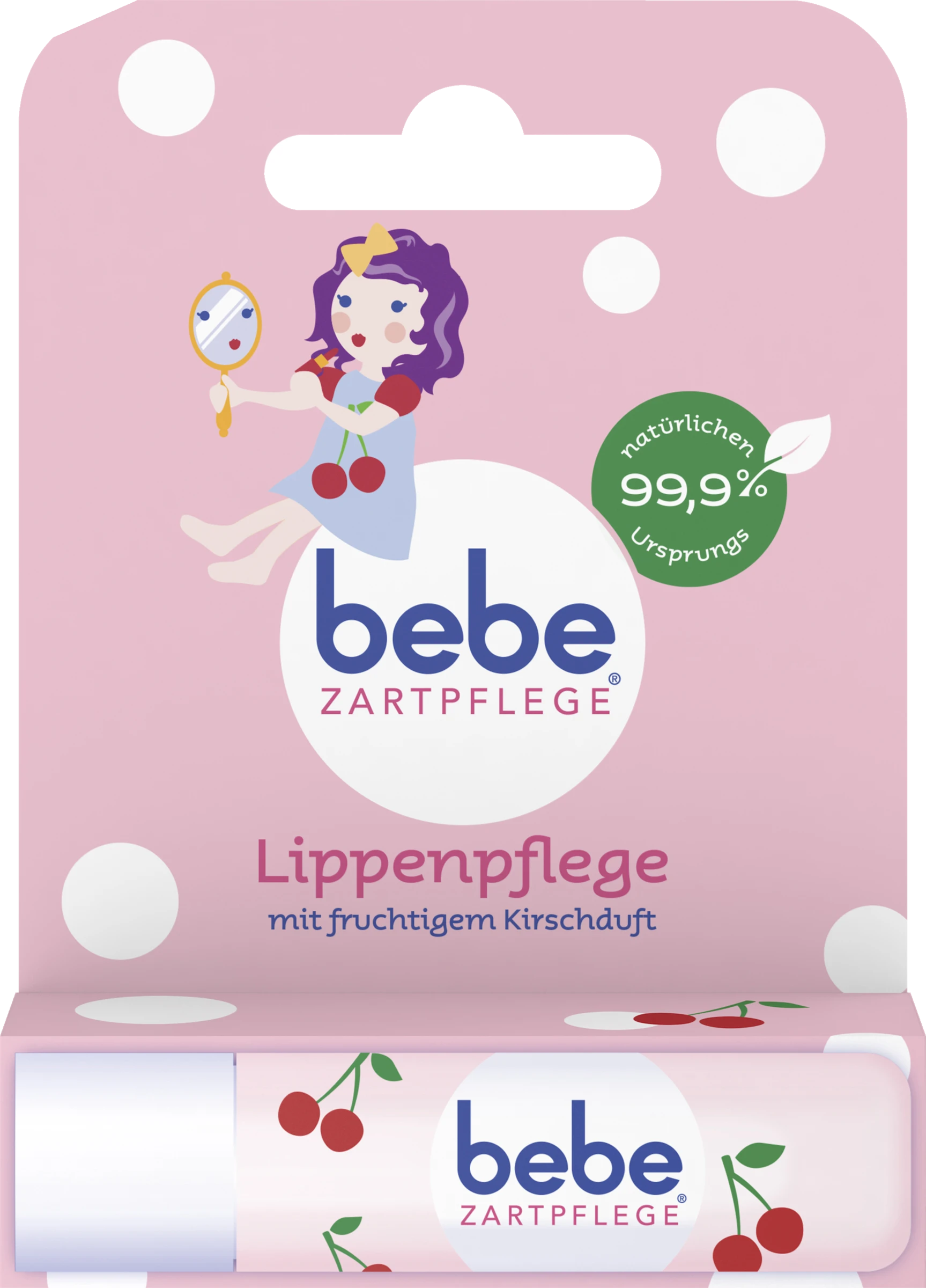 bebe Zartpflege Lippenpflege mit fruchtigem Kirschduft: Die speziell für Kinder entwickelte Formel enthält Sheabutter und ist zu 99,9 % natürlichen Ursprungs. Sie pflegt zarte Kinderlippen und schützt sie vor dem Austrocknen. Sie hinterlässt einen Pflegefilm und duftet herrlich fruchtig nach Kirschen. Hautverträglichkeit dermatologisch bestätigt. Bebe Zartpflege®. Die zarteste Pflege von bebe.