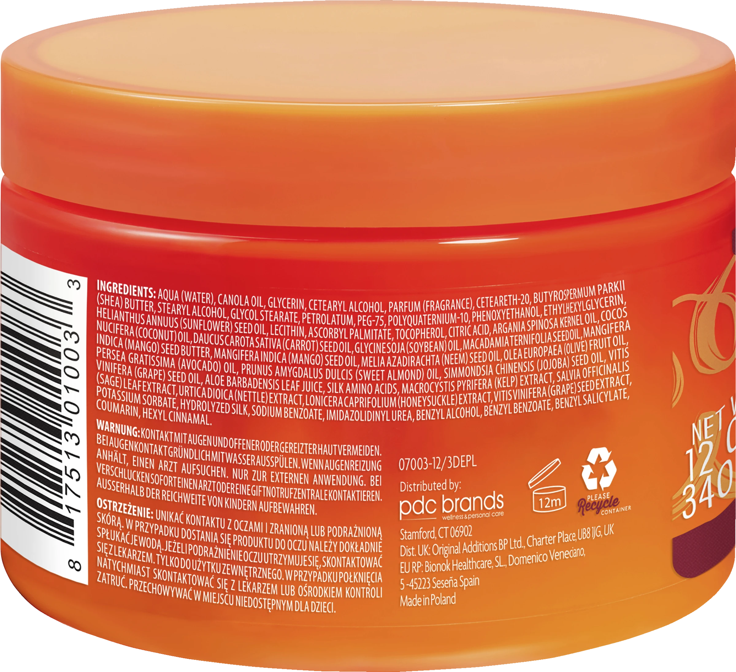 Aqua (Water), Canola Oil, Glycerin, Cetearyl Alcohol, Parfum (Fragrance), Ceteth-20, Butyrospermum Parkii (Shea) Butter, Stearyl Alcohol, Glycol Stearate, Petrolatum, PEG-75, Polyquaternium-10, Phenoxyethanol, Ethylhexylglycerin, Helianthus Annus (Sunflower) Seed Oil, Lecithin, Ascorbyl Palmiate, Tocopherol, Citric Acid, Argania Spinosa Kernel Oil, Cocos Nucifera (Coconut) Oil, Daucus Carota Sativa Seed Oil, Glycine Soja (Soyabean) Oil, Macadamia Ternifolia Seed Oil, Mangifera Indica (Mango) Seed Butter, Mangifera Indica (Mango) Seed Oil, Melia Azadirachta (Neem) Seed Oil, Olea Europaea (Olive) Fruit Oil, Persea Gratisima (Avocado) Oil, Prunus Amygdalus Dulcis (Sweet Almond) Oil, Simmondsia Chinensis (Jojoba) Seed Oil, Vitis Vinifera (Grape) Seed Oil, Aloe Barbadensis (Aloe Vera) Leaf Juice, Silk Amino Acids, Macrocystis Pyrifera Extract, Salvia Officinalis (Sage) Leaf Extract, Urtica Dioica (Nettle) Extract, Lonicera Caprifolium (Honeysuckle) Extract, Vitis Vinifera (Grape) Seed Extract, Potassium Sorbate, Hydrolyzed Silk, Sodium Benzonate, Imidazolidinyl Urea, Benzyl Alcohol, Benzyl Benzoate, Benzyl Salicylate, Coumarin, Hexyl Cinnamal
