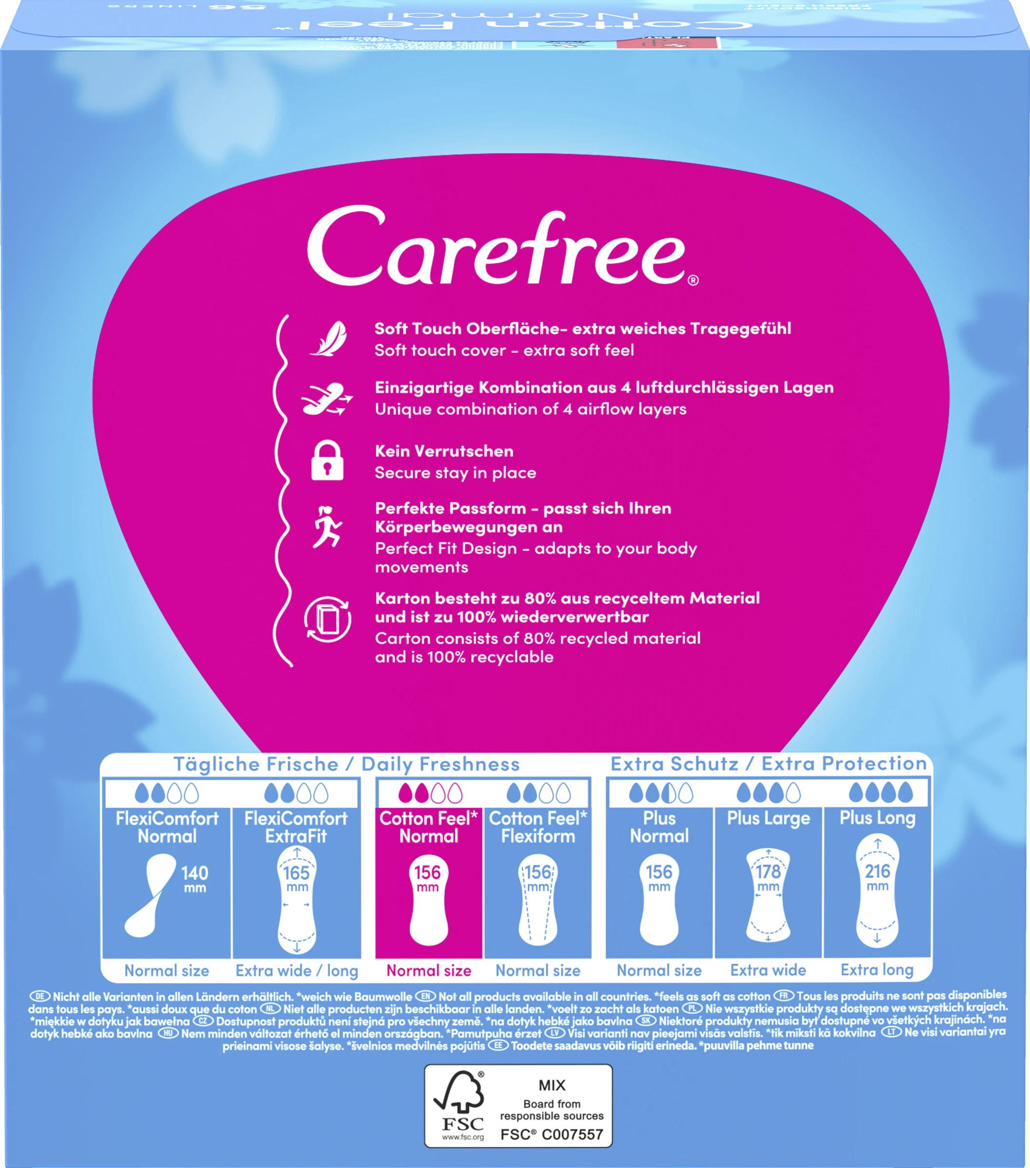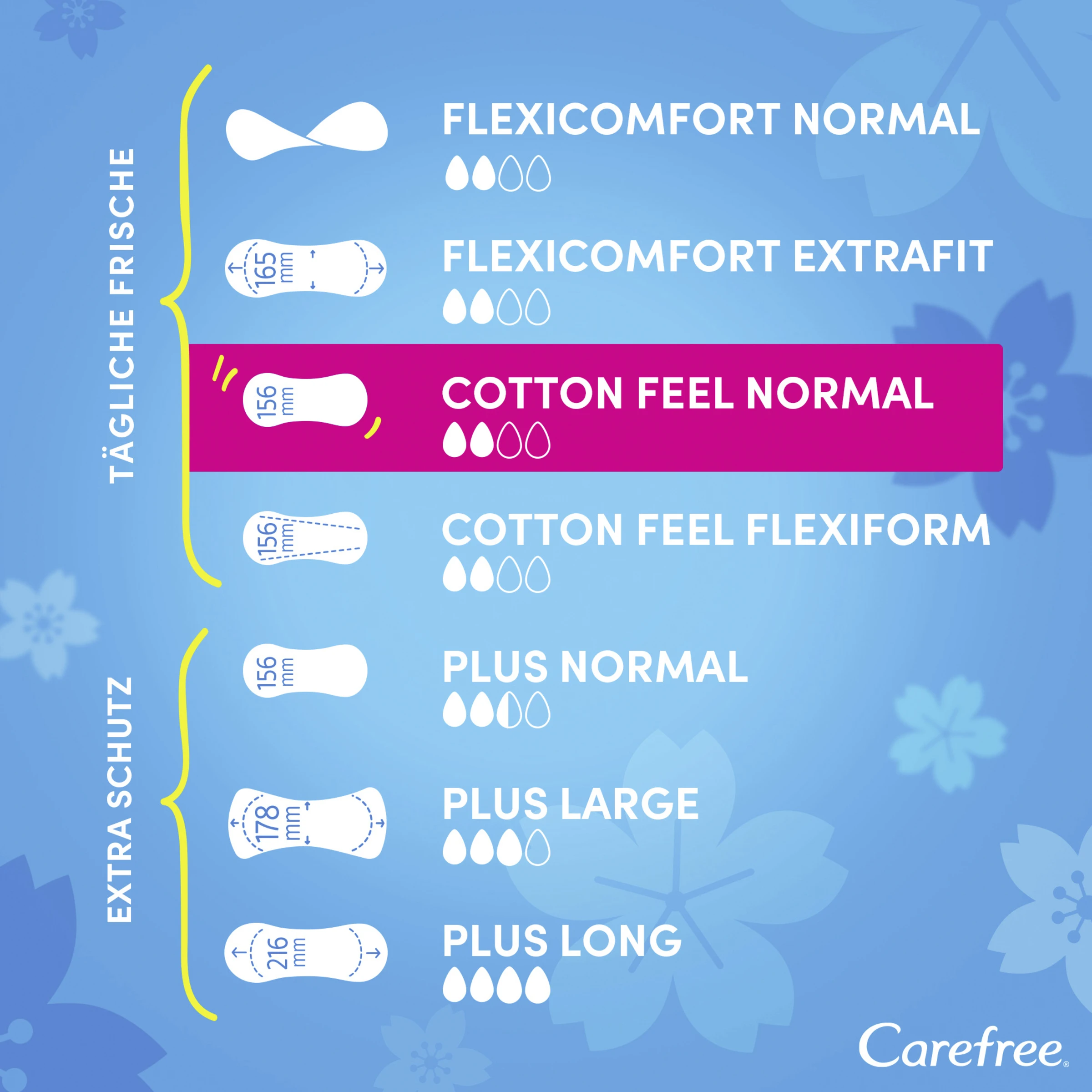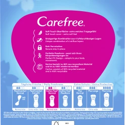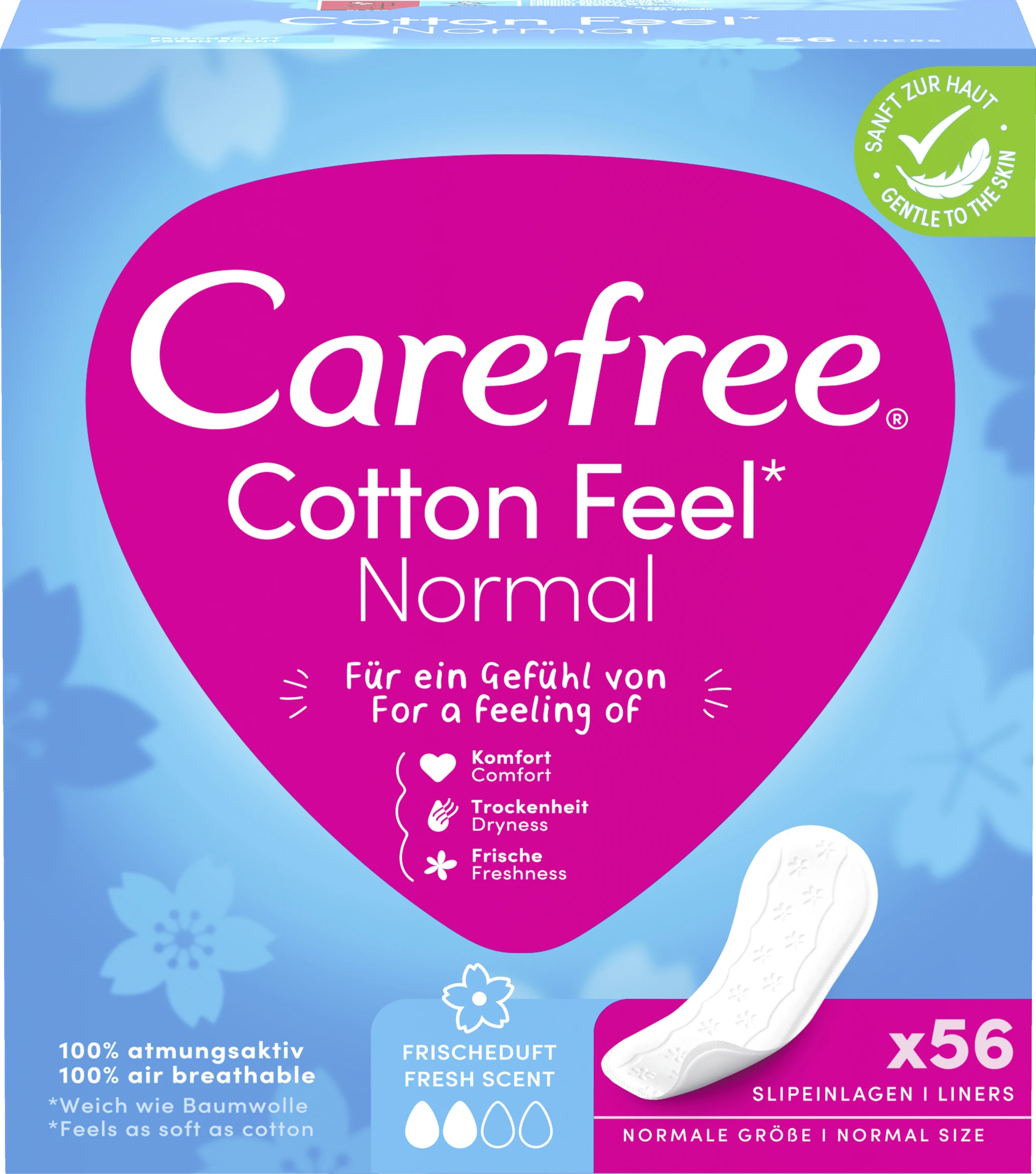 Neues Design: Die Carefree Slipeinlagen Cotton Feel Normal mit Frischeduft sind zu 100% atmungsaktiv und verleihen ein Gefühl von Komfort, Trockenheit und Frische. Zudem sind sie so weich wie Baumwolle. Die Soft Touch Oberfläche bietet ein extra weiches Tragegefühl und die perfekte Passform passt sich den Körperbewegungen an. Darüber hinaus ist die extra weiche Oberfläche dermatologisch getestet.