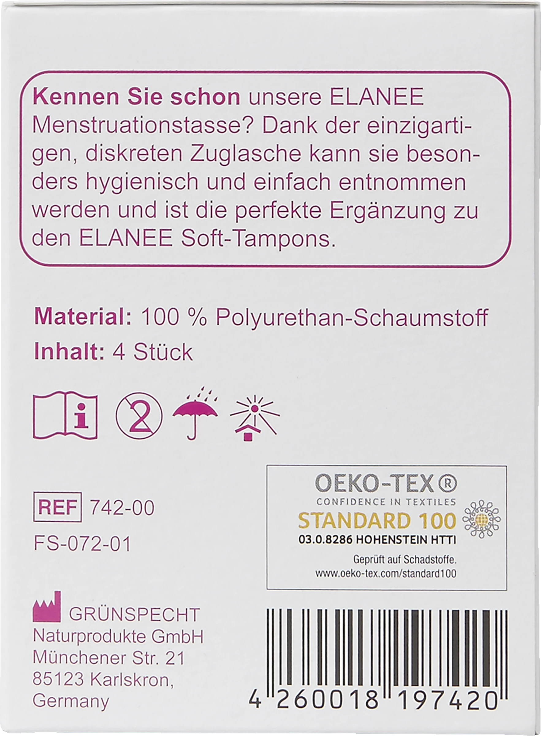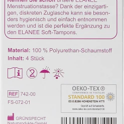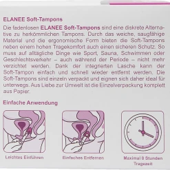 Die fadenlosen ELANEE Soft-Tampons sind eine diskrete Alternative zu herkömmlichen Tampons. Durch das weiche, saugfähige Material und die ergonomische Form bieten die Soft-Tampons neben einem hohen Tragekomfort auch einen sicheren Schutz. So muss auf alltägliche Dinge wie Sport, Sauna, Schwimmen oder Geschlechtsverkehr – auch während der Periode – nicht mehr verzichtet werden. Dank der integrierten Lasche kann der Soft-Tampon einfach und schnell wieder entfernt werden. Die Soft-Tampons sind einzeln verpackt und eignen sich daher ideal für unterwegs. Aus Liebe zur Umwelt ist die Einzelverpackung komplett aus Papier.