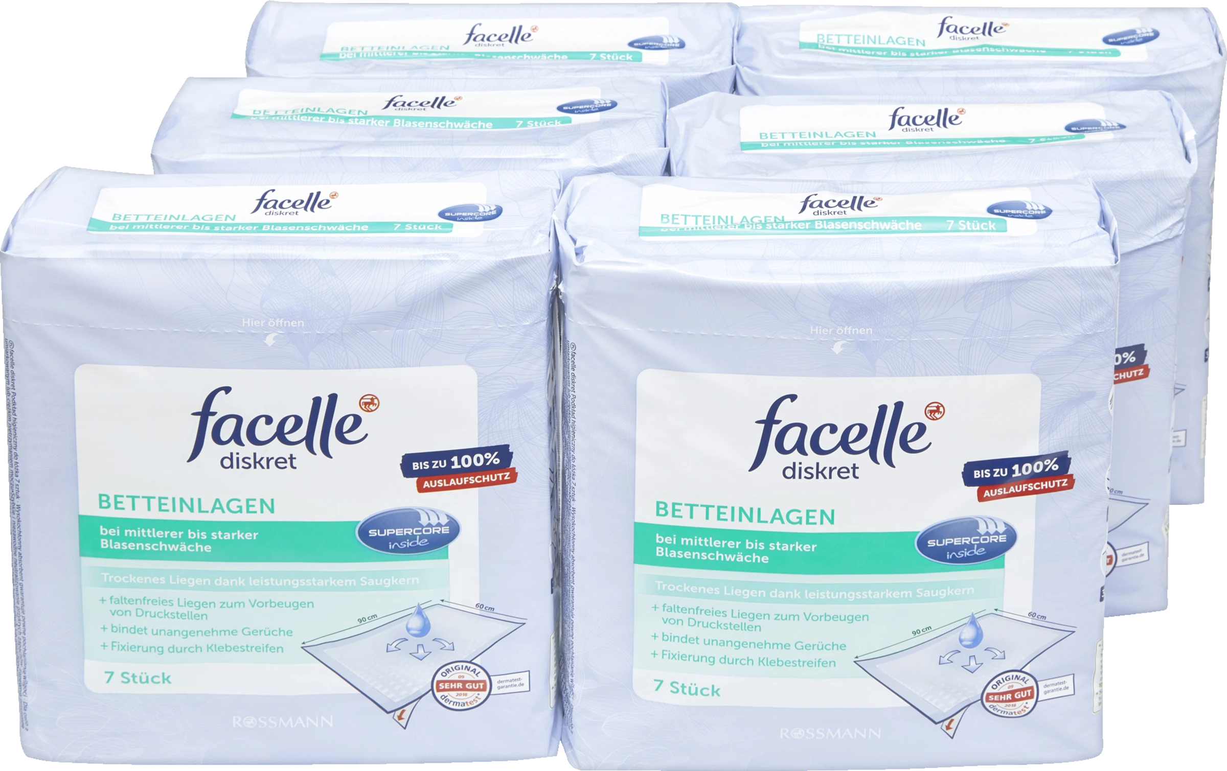 Die facelle Betteinlage ist eine Kombination aus starker Saugkraft und einer weichen Oberfläche. Sie bietet ein sicheres und trockenes Gefühl – die ganze Nacht. Der Saugkern SuperCore® nimmt die Flüssigkeit sicher auf und verteilt sie gleichmäßig auf der Oberfläche. Unangenehme Gerüche werden sicher im Kern eingeschlossen. Kein Rücknässen mehr möglich. Die Bettunterlage ist auch hervorragend als Matratzenschutz geeignet.