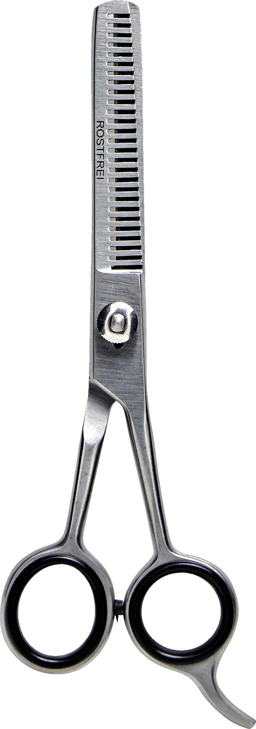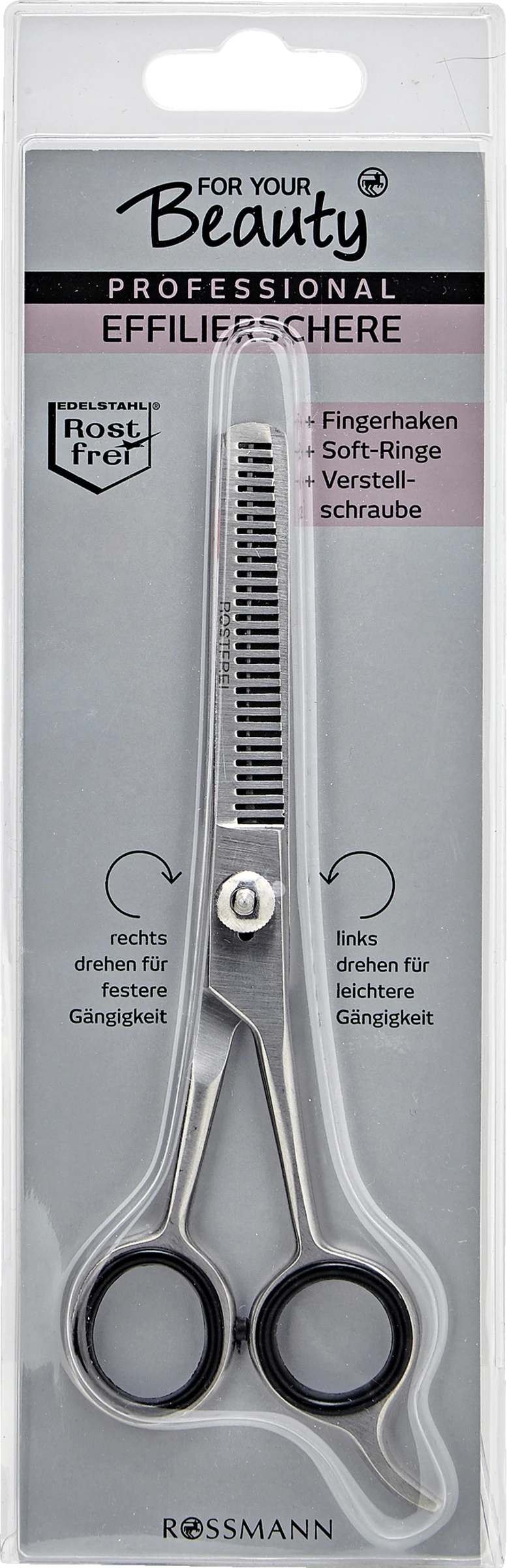 Die professionelle, einseitig gezahnte Effilierschere eignet sich ideal zum Ausdünnen von dichtem Haar sowie zum Schneiden von Übergängen und fransigen Konturen. Die unterschiedlich großen, mit Gummieinsätzen versehenen Scherenaugen und der Fingerhaken ermöglichen ein komfortables, ermüdungsfreies Arbeiten.