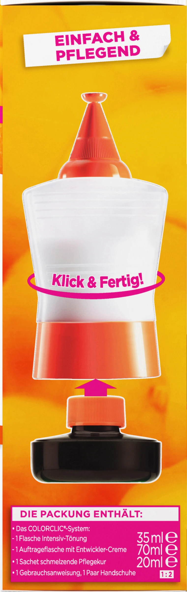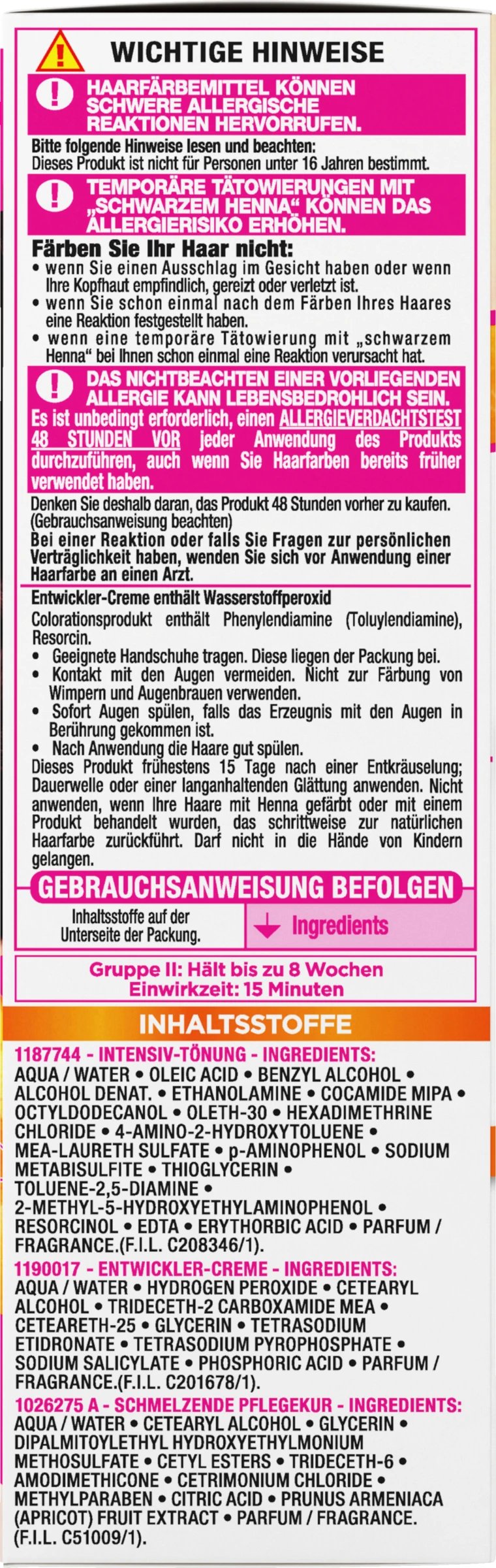 Tönung: “AQUA /WATER • OLEIC ACID • BENZYL ALCOHOL •ALCOHOL DENAT. • ETHANOLAMINE • COCAMIDE MIPA •OCTYLDODECANOL • OLETH-30 • HEXADIMETHRINECHLORIDE • 4-AMINO-2-HYDROXYTOLUENE •MEA-LAURETH SULFATE • p-AMINOPHENOL • SODIUMMETABISULFITE • THIOGLYCERIN •TOLUENE-2,5-DIAMINE •2-METHYL-5-HYDROXYETHYLAMINOPHENOL •RESORCINOL • EDTA • ERYTHORBIC ACID • PARFUM /FRAGRANCE”Entwickler-Creme: “AQUA / WATER • HYDROGEN PEROXIDE • CETEARYLALCOHOL • TRIDECETH-2 CARBOXAMIDE MEA •CETEARETH-25 • GLYCERIN • TETRASODIUMETIDRONATE • TETRASODIUM PYROPHOSPHATE •SODIUM SALICYLATE • PHOSPHORIC ACID • PARFUM /FRAGRANCE.”Schmelzende Pflegekur: “AQUA / WATER • CETEARYL ALCOHOL • GLYCERIN •DIPALMITOYLETHYL HYDROXYETHYLMONIUMMETHOSULFATE • CETYL ESTERS • TRIDECETH-6 •AMODIMETHICONE • CETRIMONIUM CHLORIDE •METHYLPARABEN • CITRIC ACID • PRUNUS ARMENIACA(APRICOT) FRUIT EXTRACT • PARFUM / FRAGRANCE”