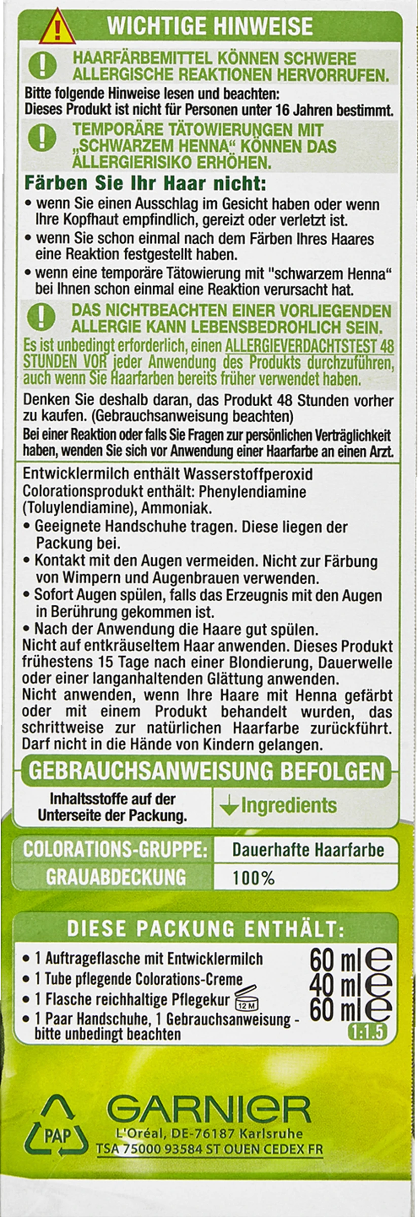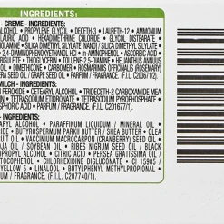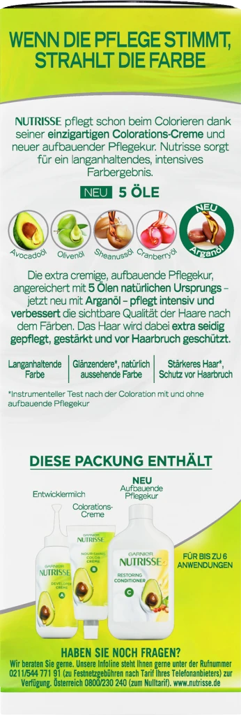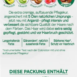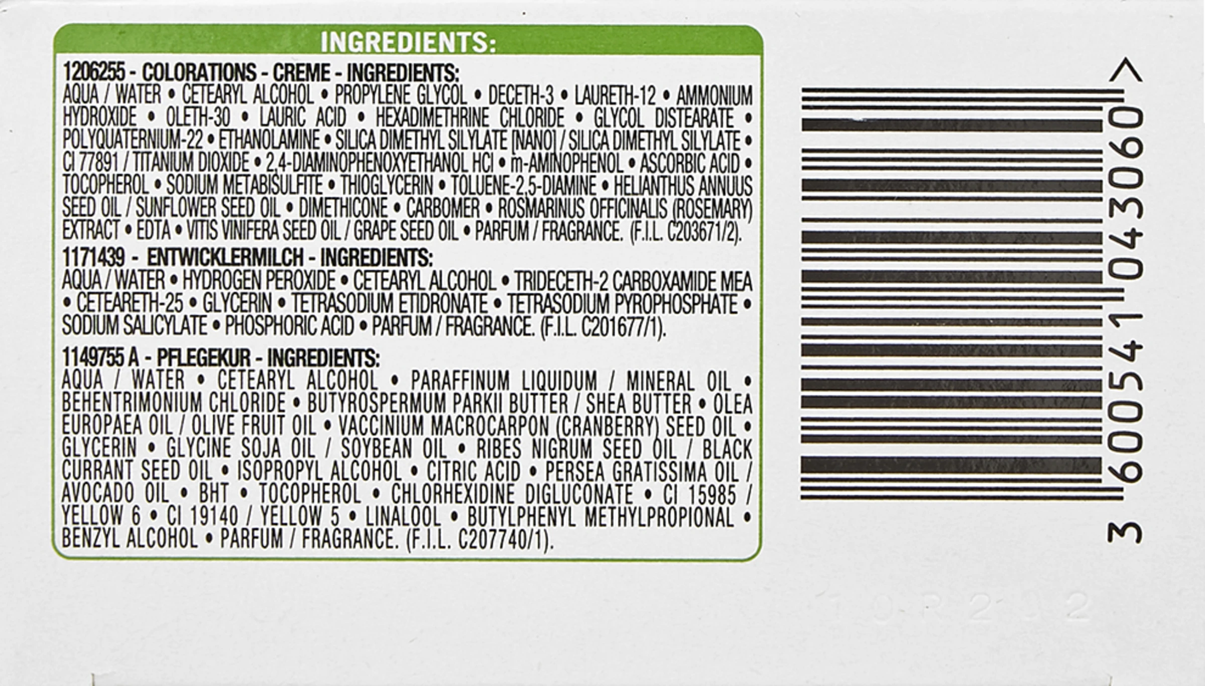 Colorationscreme: “AQUA / WATER • CETEARYL ALCOHOL • PROPYLENE GLYCOL • DECETH-3 • LAURETH-12 • AMMONIUMHYDROXIDE • OLETH-30 • LAURIC ACID • HEXADIMETHRINE CHLORIDE • GLYCOL DISTEARATE •POLYQUATERNIUM-22 • ETHANOLAMINE • SILICA DIMETHYL SILYLATE [NANO] / SILICA DIMETHYLSILYLATE • CI 77891 / TITANIUM DIOXIDE • 2,4-DIAMINOPHENOXYETHANOL HCl • m-AMINOPHENOL •ASCORBIC ACID • TOCOPHEROL • SODIUM METABISULFITE • THIOGLYCERIN • TOLUENE-2,5-DIAMINE •HELIANTHUS ANNUUS SEED OIL / SUNFLOWER SEED OIL • DIMETHICONE • CARBOMER • ROSMARINUSOFFICINALIS (ROSEMARY) EXTRACT • EDTA • VITIS VINIFERA SEED OIL / GRAPE SEED OIL • PARFUM /FRAGRANCE”Entwicklermilch oder -creme: “AQUA / WATER • HYDROGEN PEROXIDE • CETEARYL ALCOHOL • TRIDECETH-2 CARBOXAMIDE MEA• CETEARETH-25 • GLYCERIN • TETRASODIUM ETIDRONATE • TETRASODIUM PYROPHOSPHATE •SODIUM SALICYLATE • PHOSPHORIC ACID • PARFUM / FRAGRANCE”Pflegekur: “AQUA / WATER • CETEARYL ALCOHOL • DIMETHICONE • GLYCERIN • BEHENTRIMONIUM CHLORIDE •OLEA EUROPAEA FRUIT OIL / OLIVE FRUIT OIL • ARGANIA SPINOSA KERNEL OIL • VACCINIUMMACROCARPON (CRANBERRY) SEED OIL • HELIANTHUS ANNUUS SEED OIL / SUNFLOWER SEED OIL •ROSMARINUS OFFICINALIS LEAF EXTRACT / ROSEMARY LEAF EXTRACT • PERSEA GRATISSIMA OIL /AVOCADO OIL • BUTYROSPERMUM PARKII BUTTER / SHEA BUTTER • AMODIMETHICONE • ISOPROPYLALCOHOL • CAPRYLYL GLYCOL • CITRIC ACID • LACTIC ACID • TOCOPHEROL • SODIUM BENZOATE •CETRIMONIUM CHLORIDE • LINALOOL • BENZYL ALCOHOL • PARFUM / FRAGRANCE”