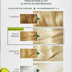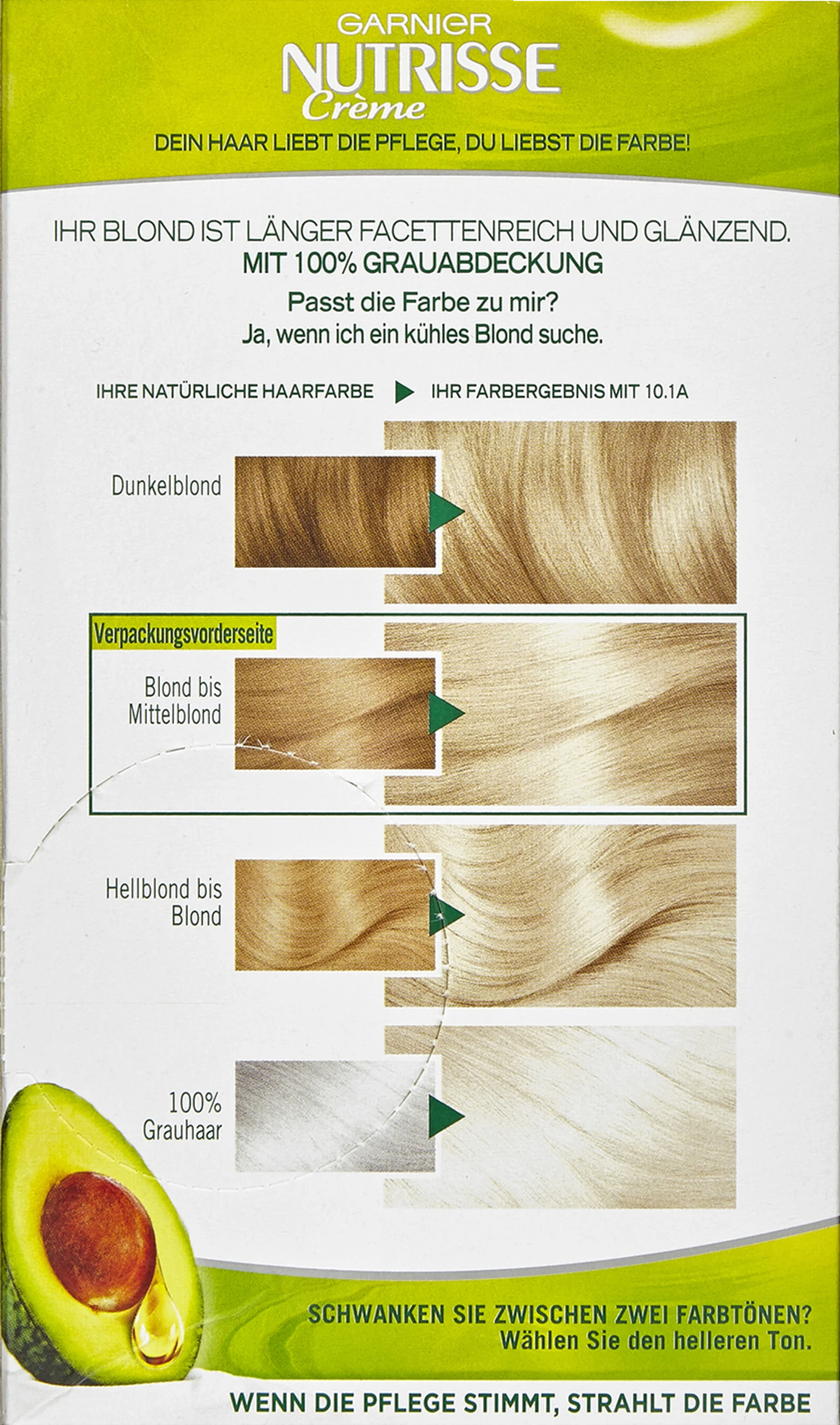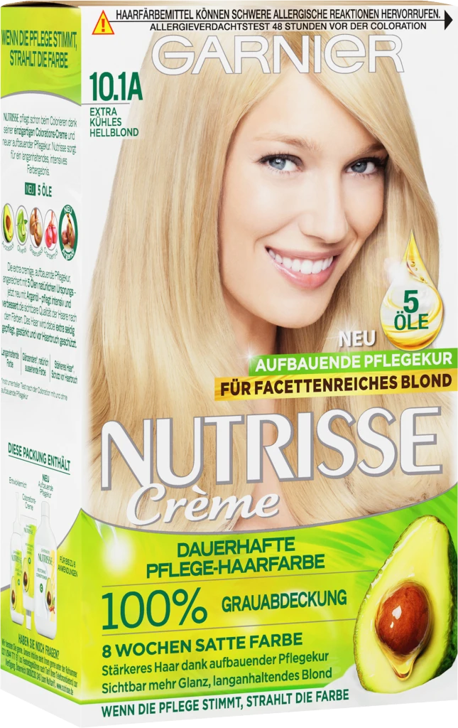 Garnier Nutrisse Nr. 10.1A Extra kühles Hellblond verleiht dem Haar seidig strahlenden Glanz und ein extra kühles Hellblond. Sogar graue Haare werden zu 100 % abgedeckt. Das Ergebnis ist ein facettenreiches Blond mit einem harmonischen Farbverlauf, das 8 Wochen lang farbintensiv strahlt.Besonders angenehm ist die einfache Anwendung der Coloration. Dank der Creme-Textur tropft sie nicht und lässt sich gleichmäßig ins Haar einarbeiten. Dabei versorgt sie das Haar intensiv mit Pflege, denn die Formel ist mit 5 Fruchtölen angereichert: Olive, Shea-Nuss, Avocado, Argan und Cranberry nähren das Haar in der Tiefe. Mit dem fruchtigen Duft wird das Colorieren zu einem sinnlichen Erlebnis.