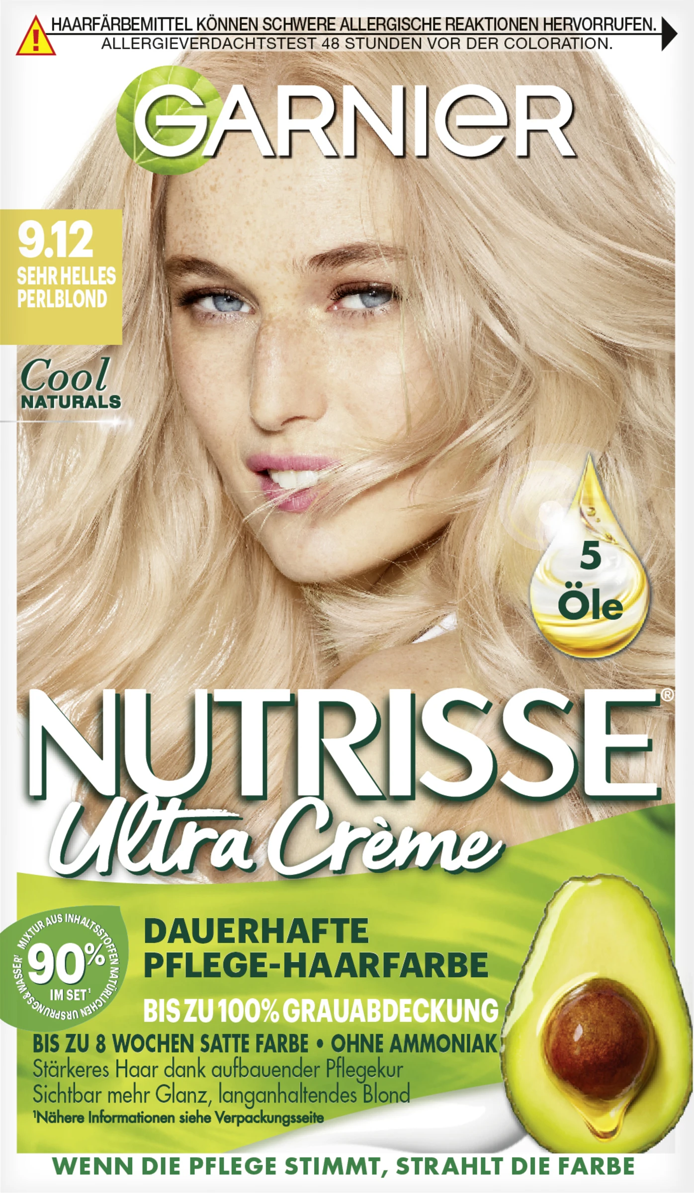Die Garnier Nutrisse Ultra Crème Dauerhafte Pflege-Haarfarbe 9.12 Sehr Helles Perlblond verleiht dem Haar eine strahlende Haarfarbe, die bis zu acht Wochen hält und gleichzeitig bis zu 100 % Grauabdeckung bietet. Dabei enthält die Haarfarbe 90 % Inhaltsstoffe natürlichen Ursprungs. Dank der aufbauenden Pflegekur wird das Haar gestärkt und Haarbruch beim Kämmen wird vorgebeugt. Dafür enthält diese fünf Öle natürlichen Ursprungs, zu denen Avocadoöl, Olivenöl, Kokosnussöl, Arganöl sowie Sheanussöl gehören. Die Haarfaser wird in der Farbe 9.12 Sehr Helles Perlblond gepflegt und gleichzeitig intensiv gepflegt – für langanhaltend strahlend schönes Haar voller Glanz.