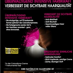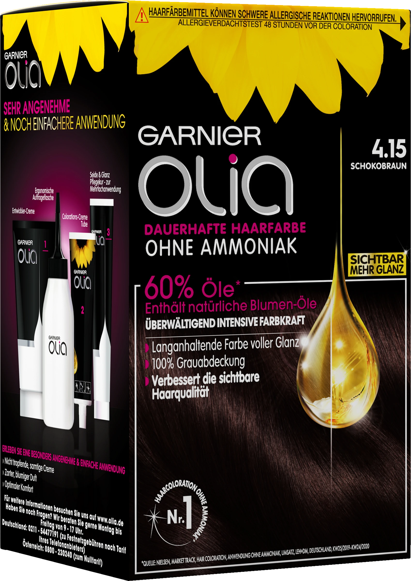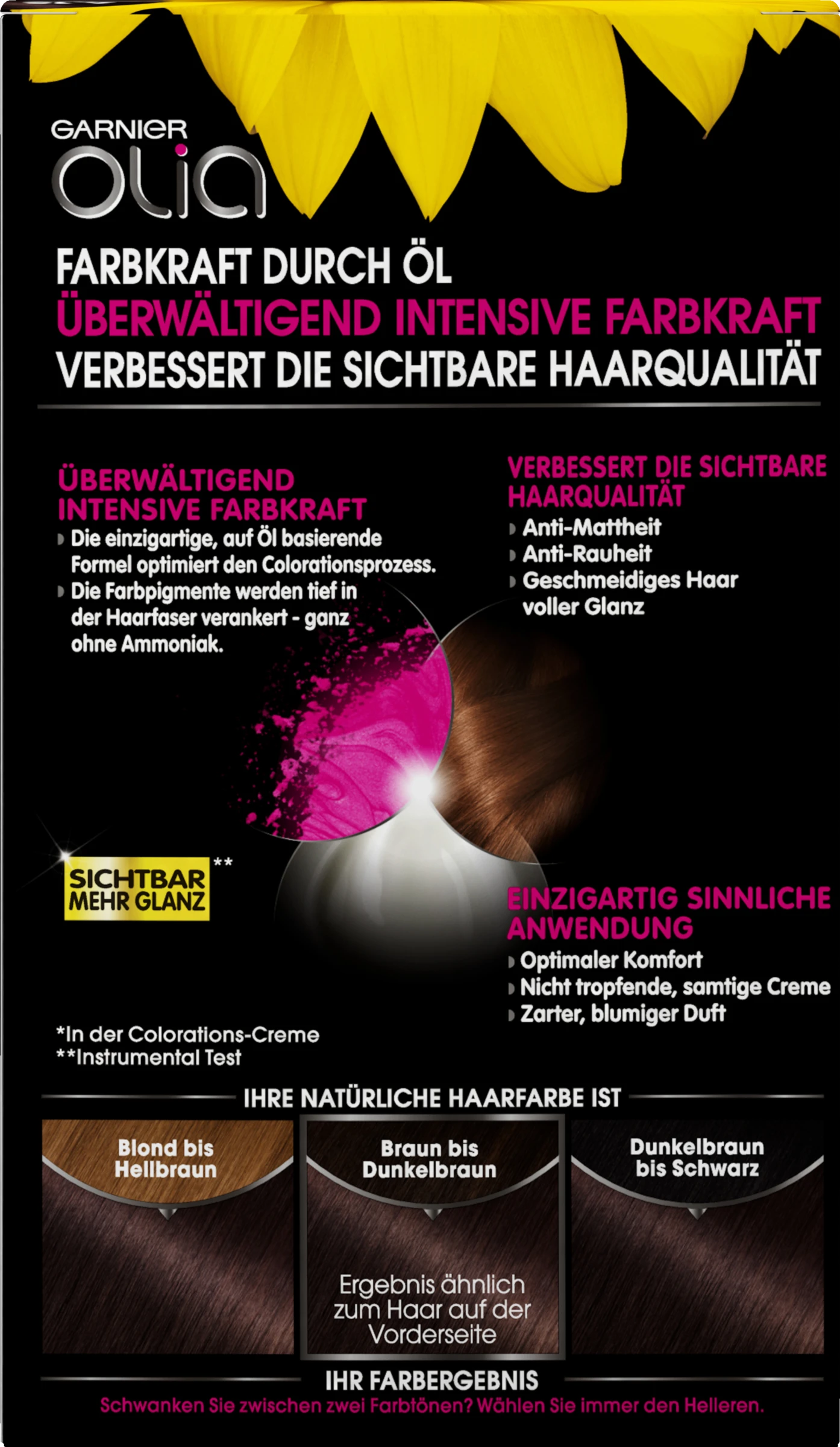 Garnier Olia Nr. 4.15 in Schokobraun verleiht den Haaren ein langanhaltendes, warmes Dunkelbraun. Die dauerhafte Haarfarbe ohne Ammoniak sorgt für intensive Farbkraft und geschmeidiges, glänzendes Haar. Die Colorations-Creme ist zu 60 % mit Ölen angereichert. Diese aktivieren die strahlende Kraft der Farbe, indem sie die hochwirksamen Pigmente tief in der Haarfaser verankern. Auch graues Haar wird zuverlässig abgedeckt.Gleichzeitig verwöhnt die Coloration das Haar mit reichhaltiger Pflege für eine sichtbar verbesserte Haarqualität.Die cremig-samtige Textur von Garnier Olia tropft nicht und lässt sich mühelos und gleichmäßig auftragen. Dabei entfaltet sie einen zart blumigen Duft.