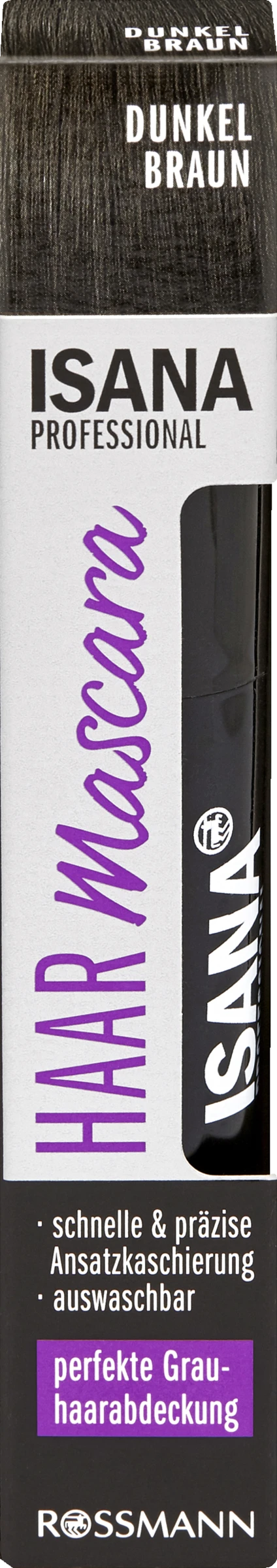 ISANA Professional Haar Mascara mit PrĂ€zisionsbĂŒrste zur schnellen Kaschierung von Ansatz und StrĂ€hnen. Die hochpigmentierte Formel deckt graue Haare zuverlĂ€ssig ab und hĂ€lt bis zur nĂ€chsten HaarwĂ€sche.