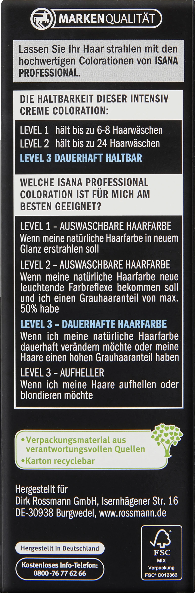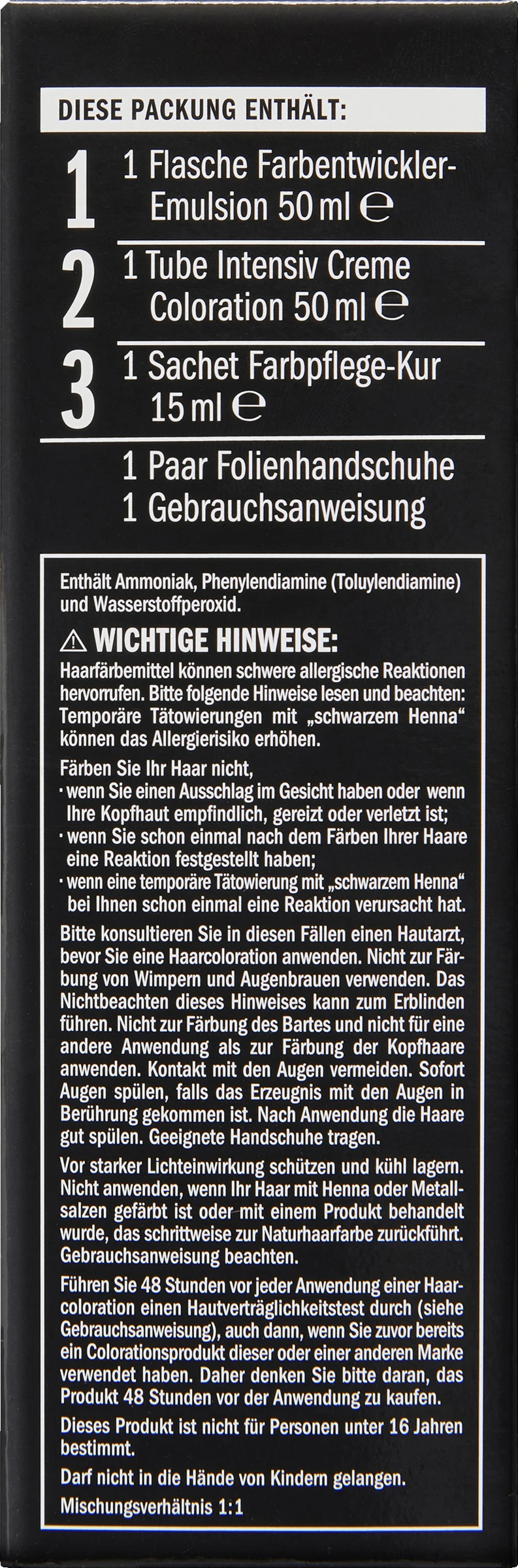 INTENSIV CREME COLORATION: Aqua, Cetearyl Alcohol, Laureth-3, Sodium Laureth Sulfate, Glyceryl Stearate SE, Ammonia, Toluene-2,5-Diamine Sulfate, Sodium Sulfate, Lanolin Alcohol, 4-Amino-2-Hydroxytoluene, Sodium Lauryl Sulfate, Sodium Sulfite, Parfum, Sodium Hydroxide, Ascorbic Acid, Disodium EDTA, Alpha-Isomethyl Ionone, Geraniol, Citronellol, Limonene, Tocopherol.