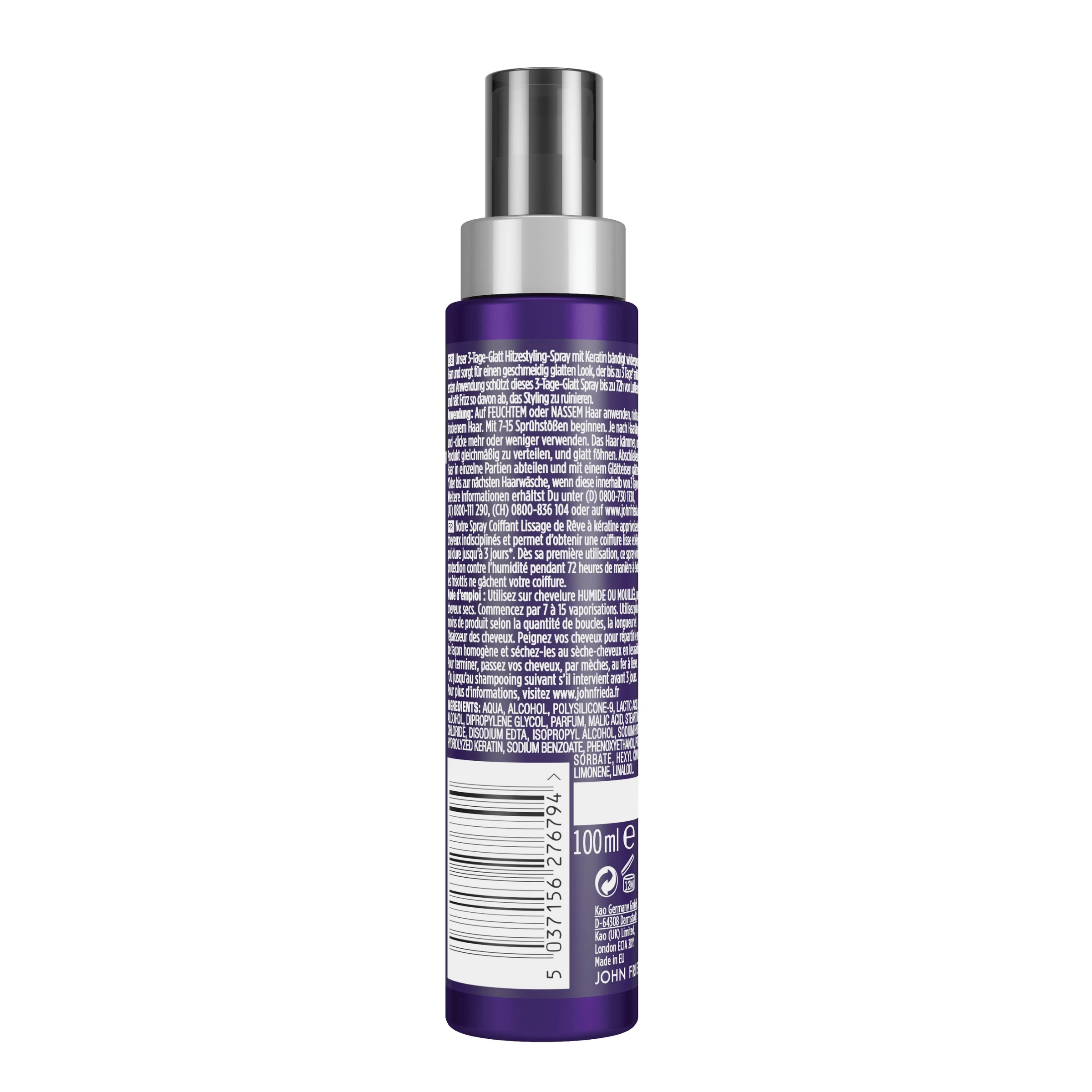 Auf feuchtem oder nassem Haar anwenden, nicht auf trockenem Haar. Mit 7-15 Sprühstößen beginnen. Je nach Haarlänge und -dicke mehr oder weniger verwenden. Das Haar kämmen, um das Produkt gleichmäßig zu verteilen, und glatt föhnen. Abschließend das Haar in einzelne Partien abteilen und mit einem Glätteisen glätten.
