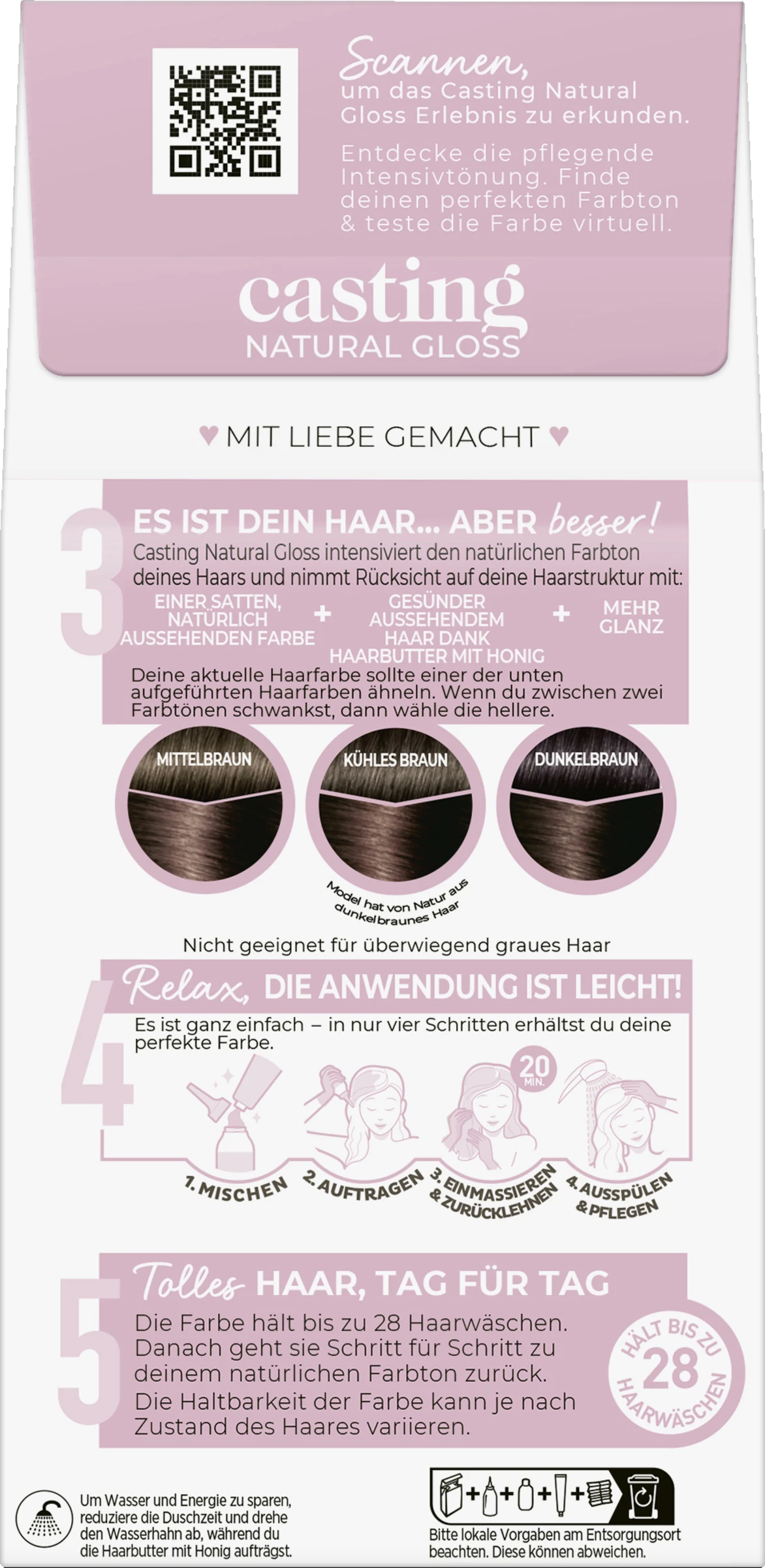 Casting Natural Gloss enthält 90 % Inhaltsstoffe natürlichen Ursprungs, die erste graue Haare harmonisch abdecken. Die Kur sorgt Strähne für Strähne für geschmeidiges, gepflegtes Haar, lässt es sichtbar gesund aussehen und sorgt für einen außergewöhnlichen Glanz. Eine satte, harmonische und glänzende Farbe, die die grauen Haare abdeckt und schnell & einfach anzuwenden ist, auch für Anfänger. Casting Natural Gloss intensiviert den natürlichen Farbton deines Haars und nimmt Rücksicht auf deine Haarstruktur. Die Farbe hält bis zu 28 Haarwäschen. Danach geht sie Schritt für Schritt zu deinem natürlichen Farbton zurück. Die Haltbarkeit der Farbe kann je nach Zustand des Haares variieren. Die semi-permanente Haarfarbe L’Oréal Paris Casting Creme Natural Gloss verleiht Ihrem Haar einen intensiven Farbton und einen strahlenden Glanz.
