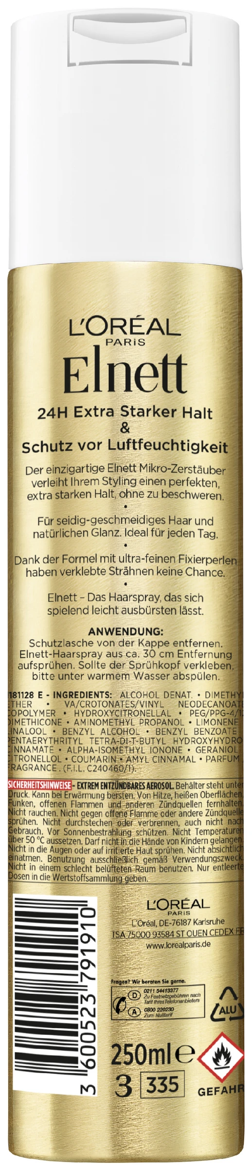 Das Elnett Haarspray Extra Stark verhilft der Frisur zu perfektem Halt und das Haar bleibt seidig-geschmeidig. Dabei lässt es sich spielend leicht wieder ausbürsten.