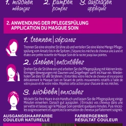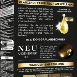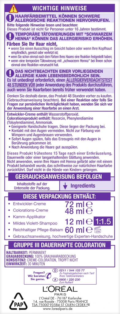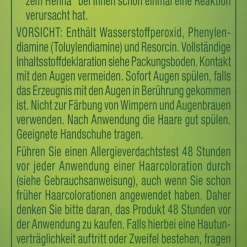 Haarfärbemittel können allergische Reaktionen hervorrufen. Bitte folgende Hinweise lesen und beachten: Diese Produkt ist nicht für Personen unter 16 Jahren bestimmt. Temporäre Tätowierungen mit “schwarzem Henna” können das Allergierisiko erhöhen. Färben Sie Ihr Haar nicht, – wenn Sie einen Ausschlag im Gesicht haben oder wenn Ihre Kopfhaut empfindlich, gereizt oder verletzt ist; – wenn Sie schon einmal nach dem Färben Ihres Haares eine Reaktion festgestellt haben; – wenn eine temporäre Tätowierung mit “schwarzem Henna” bei Ihnen schon einmal eine Reaktion verursacht hat. Das Nichtbeachten einer vorliegenden Allergie kann lebensbedrohlich sein. Es ist unbedingt erforderlich, einen Allergieverdachtstest 48 Stunden vor jeder Anwendung des Produkts durchzuführen, auch wenn Sie Haarfarben bereits früher verwendet haben. Denken Sie deshalb daran, das Produkt 48 Stunden vorher zu kaufen. (Gebrauchsanweisung beachten). Bei einer Reaktion oder falls Sie Fragen zur persönlichen Verträglichkeit haben, wenden Sie sich vor der Anwendung einer Haarfarbe an einen Arzt. Entwickler-Creme enthält Wasserstoffperoxide. Colorationsprodukt enthält: Resorcin, Phenylendiamine (Toluylendiamine), Ammoniak. Geeignete Handschuhe tragen. Diese liegen der Packung bei. Kontakt mit den Augen vermeiden. Nicht zur Färbung von Wimpern und Augenbrauen verwenden. Sofort Augen spülen, falls das Erzeugnis mit den Augen in Berührung gekommen ist. Nach Anwendung die Haare gut ausspülen. Dieses Produkt frühestens 15 Tage nach einer Entkräuselung, Dauerwelle oder einer langanhaltenden Glättung anwenden. Nicht anwenden, wenn Ihre Haare mit Henna gefärbt oder mit einem Produkt behandelt wurde, das schrittweise zur natürlichen Haarfarbe zurückführt.