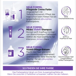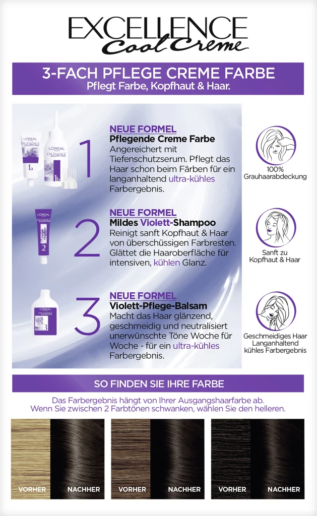 L’Oréal Paris hat die neuen Excellence Cool Creme Nuancen entwickelt, die ultra-kühle Töne dank der innovativen Violett-Formel versprechen. Violette Farbstoffe wirken warmen Tönen entgegen, die beim Färben entstehen können. Die neue violette Pflege-Routine schenkt auch nach der Coloration ein langanhaltend kühles Farbergebnis.Das milde Violett-Shampoo reinigt sanft die Kopfhaut & das Haar von überschüssigen Farbresten und glättet die Haaroberflächen für einen intensiven, kühlen Glanz.Der reichhaltige Violett-Pflege-Balsam neutralisiert unerwünschte Farbtöne und hält das Farbresultat kühl.