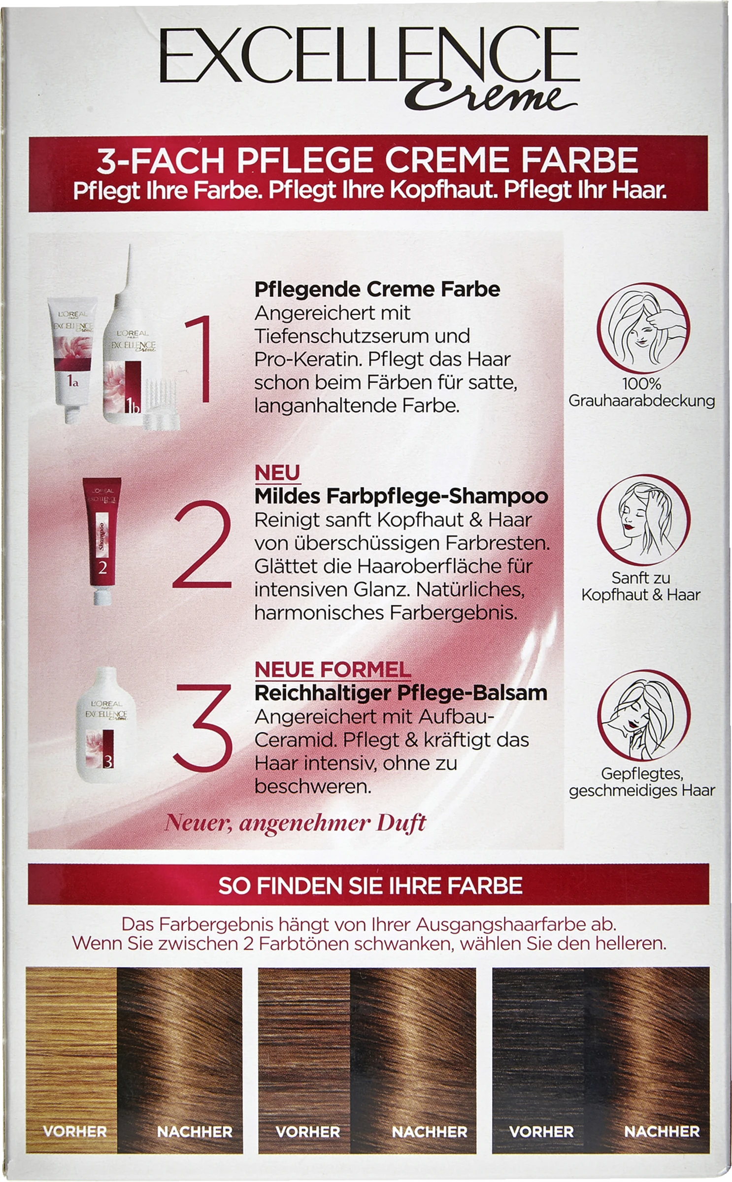 L’Oréal Paris L’Oréal Paris Excellence 6 Dunkelblond ist eine 3-fach Pflege Creme Farbe angereichert mit Tiefenschutzserum, Pro-Keratin und Aufbau-Ceramid für kräftiges, geschütztes Haar und eine langanhaltende glänzende Farbe. Jetzt neu: mit Farbpflege-Shampoo!