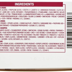 1206911 – INGREDIENTS: AQUA / WATER • CETEARYL ALCOHOL • PROPYLENE GLYCOL • DECETH-3 • LAURETH-12 • AMMONIUM HYDROXIDE • OLETH-30 • HEXADIMETHRINE CHLORIDE • LAURIC ACID • GLYCOL DISTEARATE • POLYQUATERNIUM-22 • ETHANOLAMINE • SILICA DIMETHYL SILYLATE [NANO] / SILICA DIMETHYL SILYLATE • CI 77891 / TITANIUM DIOXIDE • 2,4-DIAMINOPHENOXYETHANOL HCl • m-AMINOPHENOL • ASCORBIC ACID • SODIUM METABISULFITE • HYDROXYBENZOMORPHOLINE • THIOGLYCERIN • TOLUENE-2,5-DIAMINE • DIMETHICONE • PROLINE • CARBOMER • THREONINE • RESORCINOL • EDTA • PARFUM / FRAGRANCE (F.I.L. C202096/1).1152439 – INGREDIENTS: AQUA / WATER • HYDROGEN PEROXIDE • CETEARYL ALCOHOL • SODIUM SALICYLATE • TRIDECETH-2 CARBOXAMIDE MEA • PHOSPHORIC ACID • CETEARETH-25 • TETRASODIUM ETIDRONATE • TETRASODIUM PYROPHOSPHATE • GLYCERIN (F.I.L. C202318/2).1217017 B – INGREDIENTS:AQUA / WATER • SODIUM LAURETH SULFATE • COCAMIDOPROPYL BETAINE • DIMETHICONE • SODIUM CHLORIDE • PARFUM / FRAGRANCE •CI 77891 / TITANIUM DIOXIDE • GUAR HYDROXYPROPYLTRIMONIUM CHLORIDE • MICA • COCO-BETAINE • SODIUM BENZOATE • SODIUMHYDROXIDE • PHENOXYETHANOL • STEARETH-6 • ACETIC ACID • PEG-100 STEARATE • TRIDECETH-10 • TRIDECETH-3 • SALICYLIC ACID •FUMARIC ACID • LINALOOL • BENZYL ALCOHOL • AMODIMETHICONE • ISOEUGENOL • CARBOMER • CITRIC ACID • HEXYLENE GLYCOL • HEXYLCINNAMAL • GLYCERIN • GLYCOL DISTEARATE (F.I.L. C235641/1).1177657 – INGREDIENTS: AQUA / WATER • AMODIMETHICONE • STEARYL ALCOHOL • HYDROXYPROPYL STARCH PHOSPHATE • ISOPROPYL MYRISTATE • BEHENTRIMONIUM CHLORIDE • CETYL ALCOHOL • HYDROXYPROPYLTRIMONIUM HYDROLYZED WHEAT PROTEIN • PHENOXYETHANOL • ACETIC ACID • PEG-150 DISTEARATE • TRIDECETH-5 • TRIDECETH-6 • TRIDECETH-10 • PANTHENOL • LINALOOL • BENZYL ALCOHOL • ISOPROPYL ALCOHOL • ISOEUGENOL • 2-OLEAMIDO-1,3-OCTADECANEDIOL • CAPRYLYL GLYCOL • CETRIMONIUM CHLORIDE • HEXYL CINNAMAL • GLYCERIN • PARFUM / FRAGRANCE (F.I.L. C223464/1).