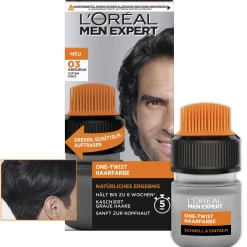 Die One-Twist Haarfarbe in Dunkelbraun von L’Oréal Paris Men Expert ist eine sanfte Haar-Coloration speziell für Männerhaar. Sie verleiht ein natürliches Aussehen und deckt graue Haare zu 100 % ab.