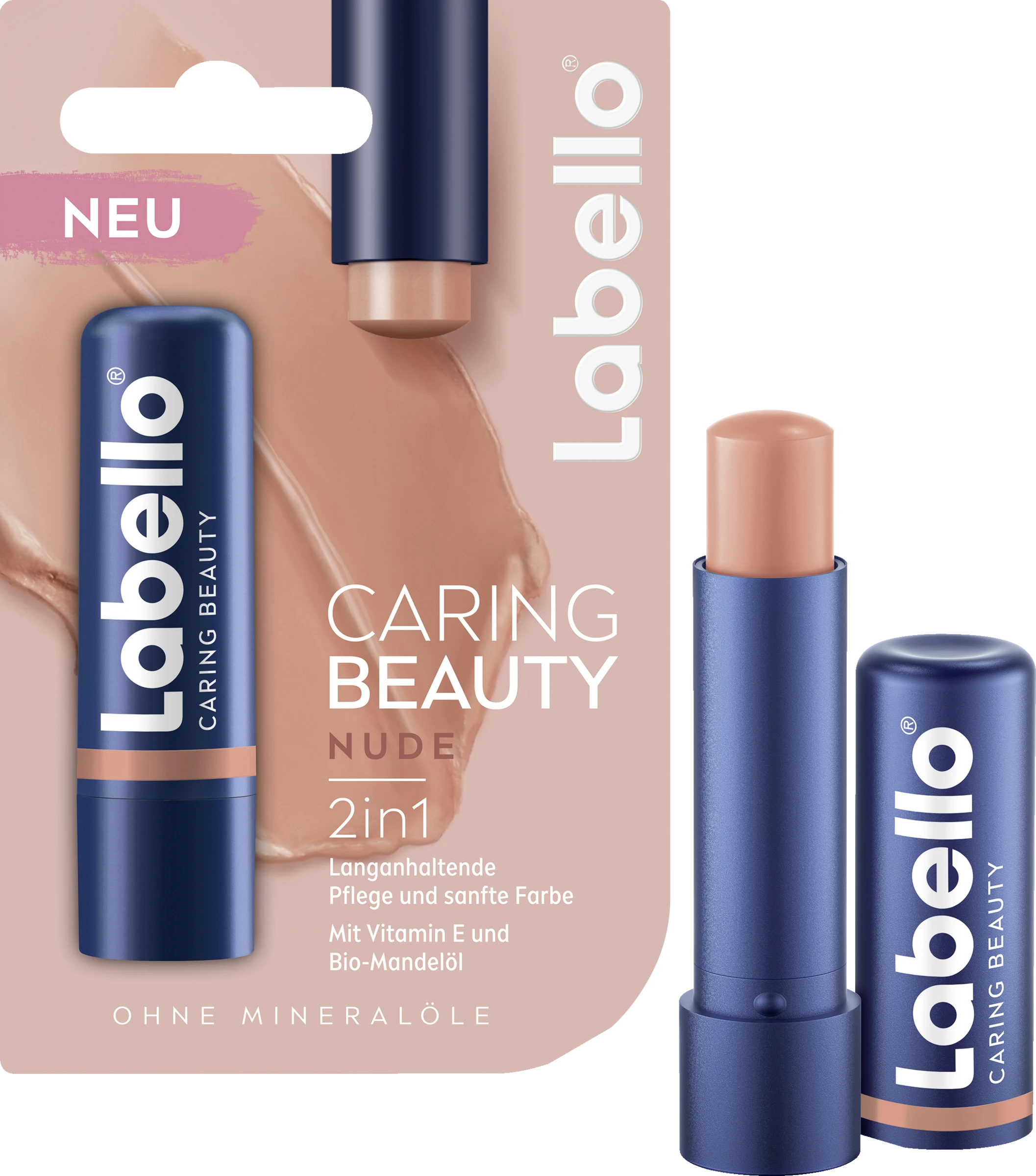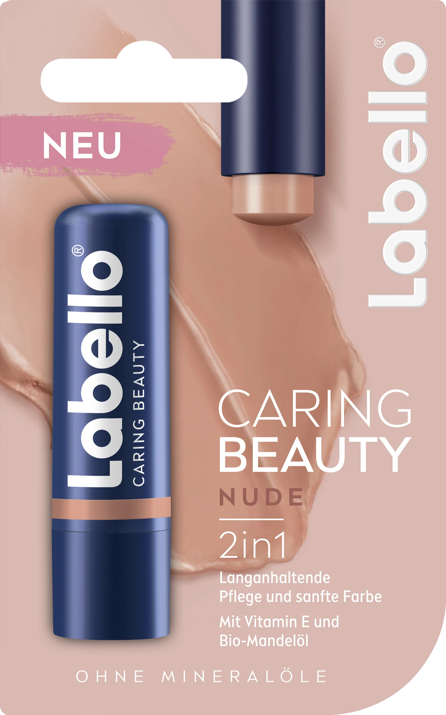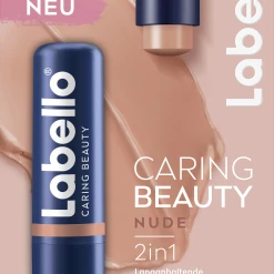 Labello Caring Beauty Nude kombiniert Farbpigmente mit der bewährten Pflege von Labello. Die mineralölfreie Formel mit Sheabutter, Bio-Mandelöl, Vitamin E und einem leicht blumigen Duft wurde speziell für den täglichen Gebrauch entwickelt. Die Formel hinterlässt ein strahlendes Finish ohne auszutrocknen, pflegt langanhaltend und ist einfach gleichmäßig aufzutragen! Hautverträglichkeit dermatologisch bestätigt.