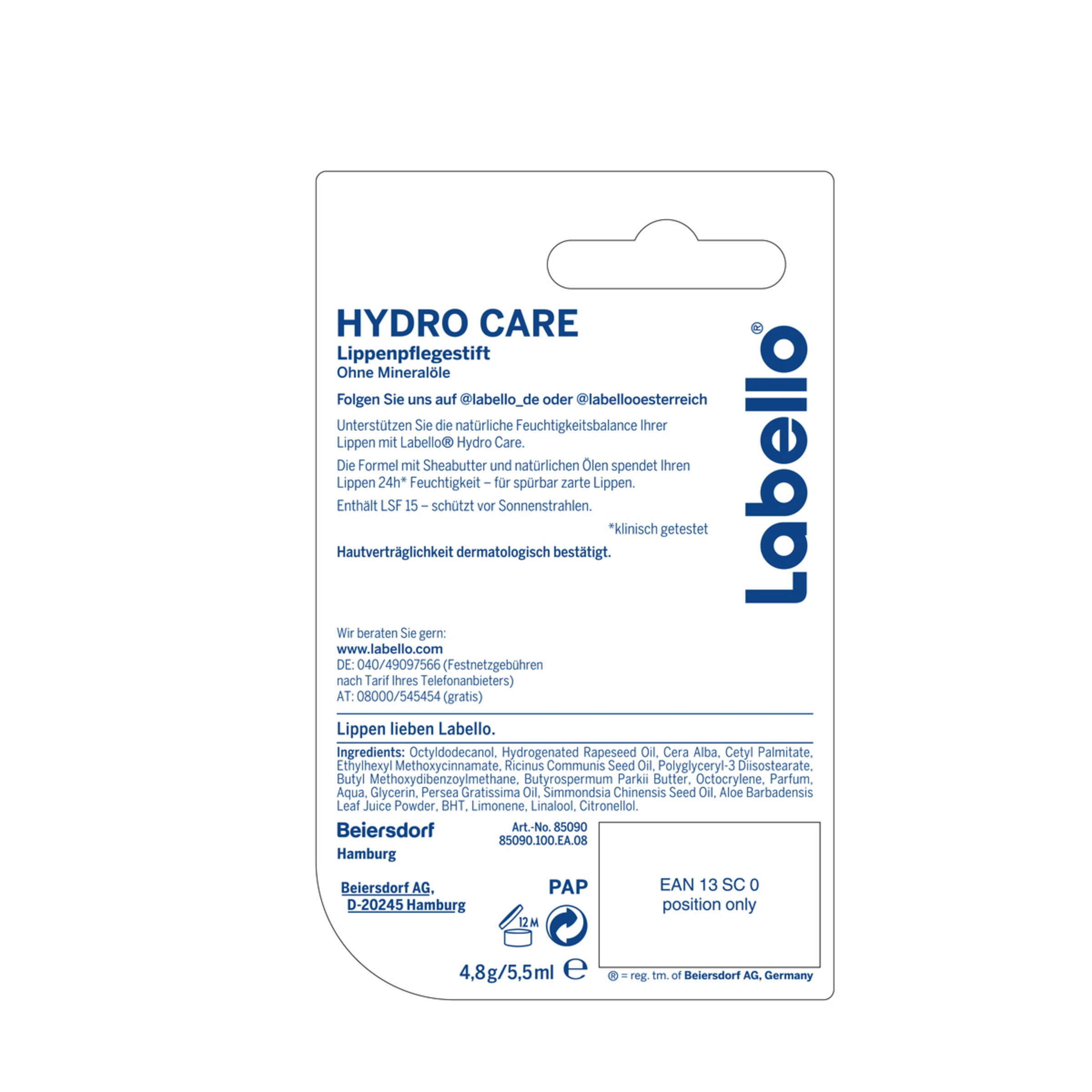Der Lippenpflegestift kann je nach Bedarf mehrmals täglich angewendet werden.Labello Hydro Care sanft und gleichmäßig auf die Lippen auftragen und bei trockenen Lippen regelmäßig wiederholen.