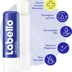 Erlebe die reichhaltige Pflege von Labello Original. Die hochwirksame Formel des Labello Original mit Sheabutter und natürlichen Ölen pflegt deine Lippen und schützt sie 24h* vor dem Austrocknen. Der Lippenpflegestift verleiht deinen Lippen ein farbloses Finish und überzeugt durch seinen klassischen und dezenten Duft. Für natürlich aussehende und spürbar gepflegte Lippen – den ganzen Tag.