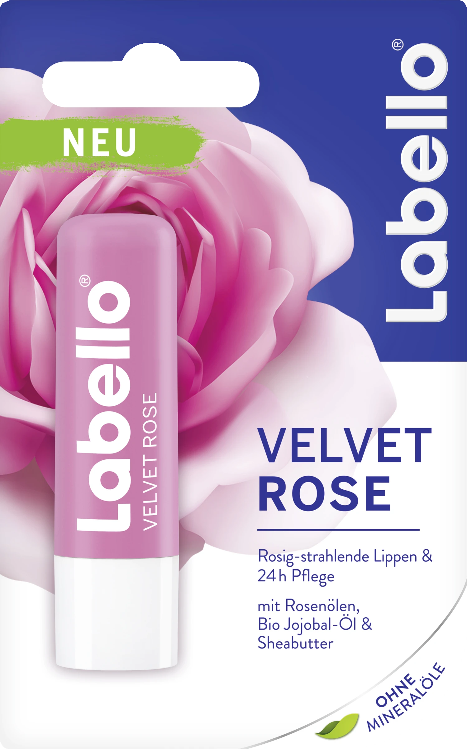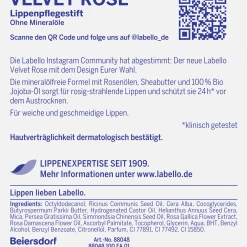 Erlebe die zarte Pflege von Labello Velvet Rose. Die Formel mit Rosenölen, Sheabutter und 100% Bio Jojoba-Öl sorgt für rosig-strahlende Lippen und schützt sie 24h* vor dem Austrocknen – ganz ohne Mineralöle. Der Lippenpflegestift verleiht deinen Lippen ein zartrosa Finish und überzeugt durch seinen dezenten Rosenduft. Für natürlich aussehende und spürbar geschmeidige Lippen – den ganzen Tag.