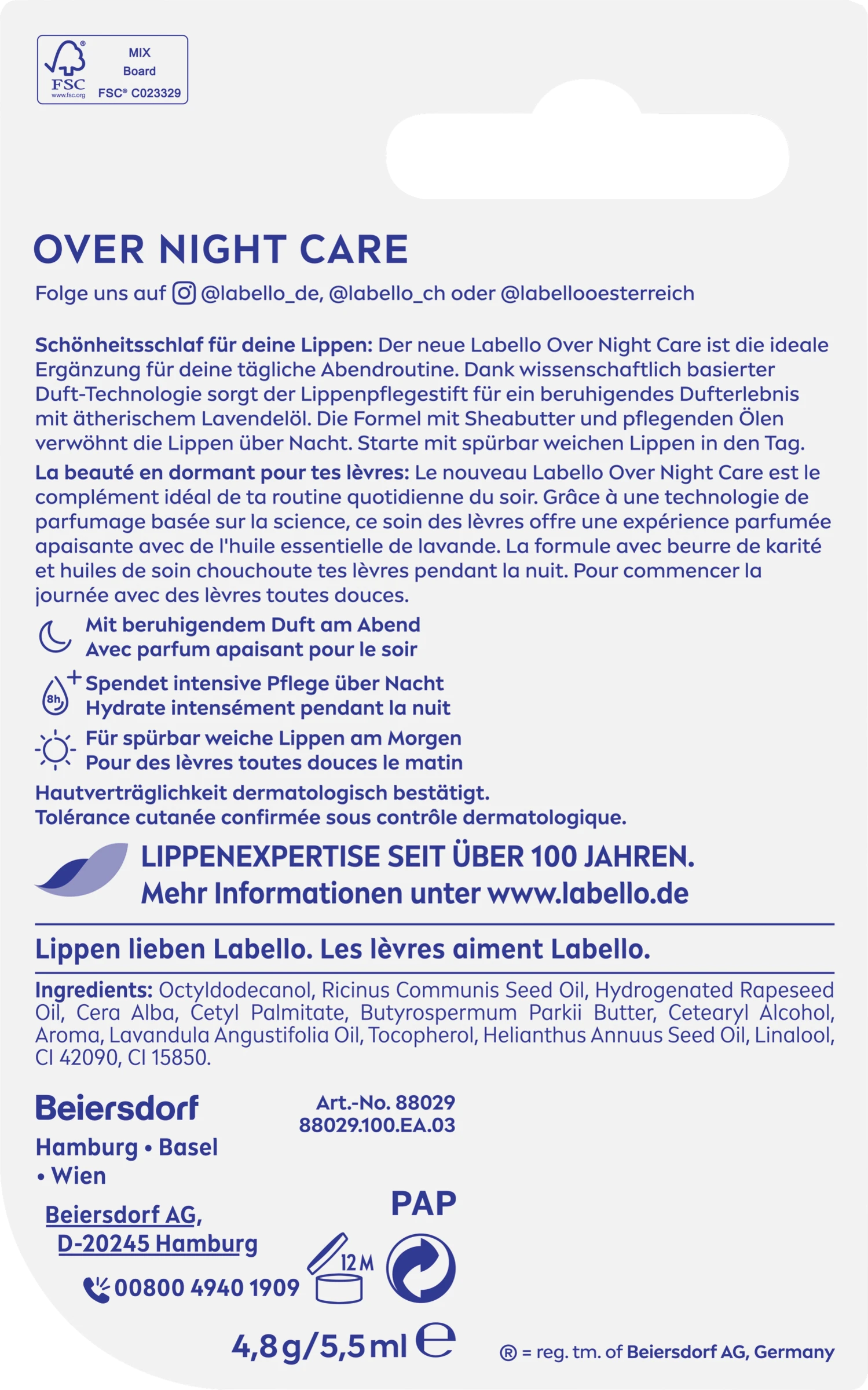 Octyldodecanol, Ricinus Communis Seed Oil, Hydrogenated Rapeseed Oil, Cera Alba, Cetyl Palmitate, Butyrospermum Parkii Butter, Cetearyl Alcohol, Aroma, Lavandula Angustifolia Oil, Tocopherol, Helianthus Annuus Seed Oil, Linalool, CI 42090, CI 15850.