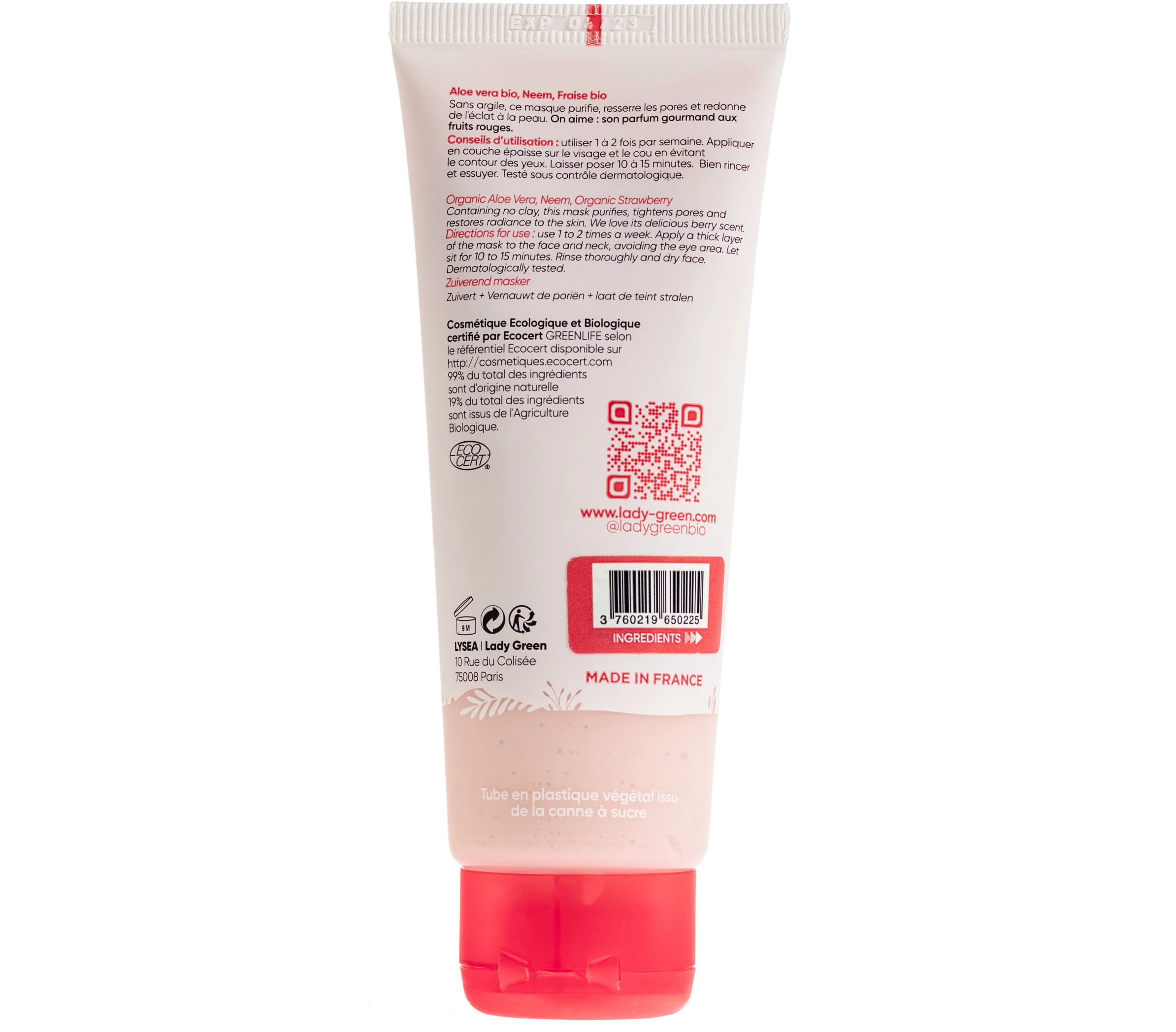 Die Formulierung der Reinigungsmaske von Lady Green wurde dafür entwickelt, normale, unreine sowie fettige Haut zu klären und ihr wieder zu ihrem gesunden Strahlen zu verhelfen. Dank Bio-Aloe Vera, Neem und Bio-Erdbeere wirkt sie überdies intensiv klärend sowie adstringierend. Für ein gleichmäßiges, verfeinertes Hautbild