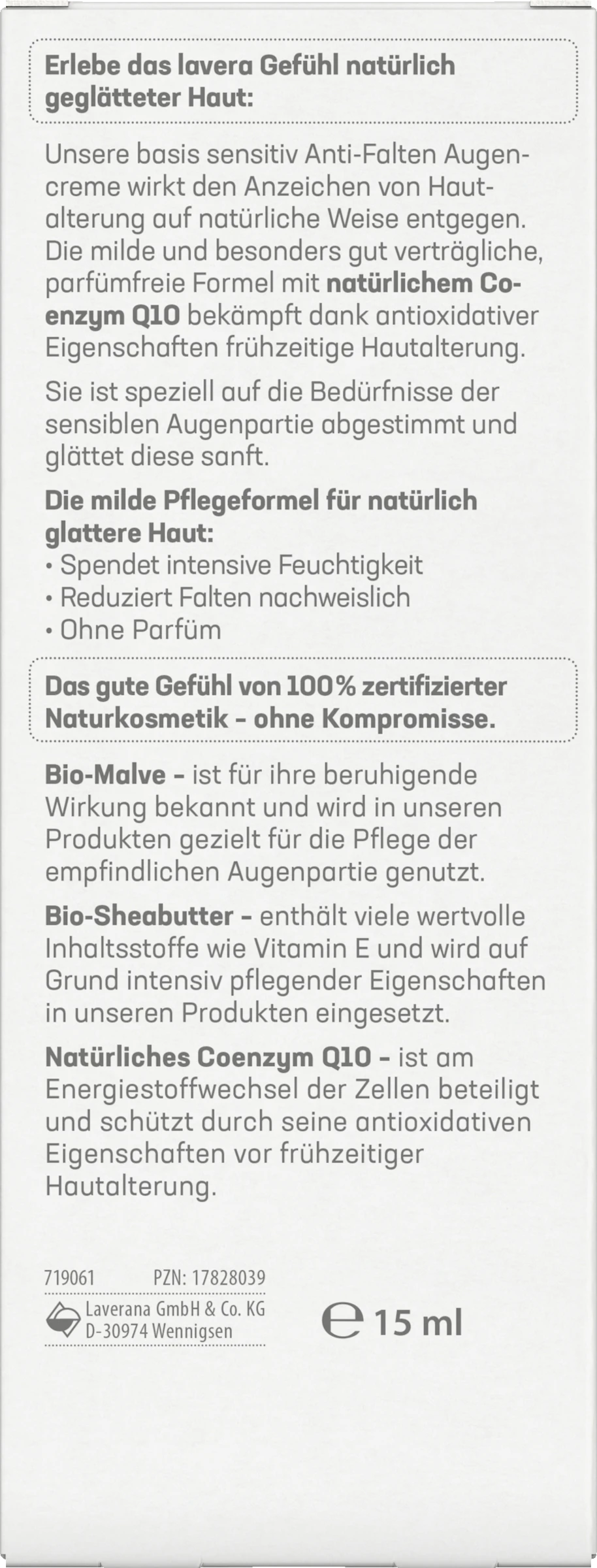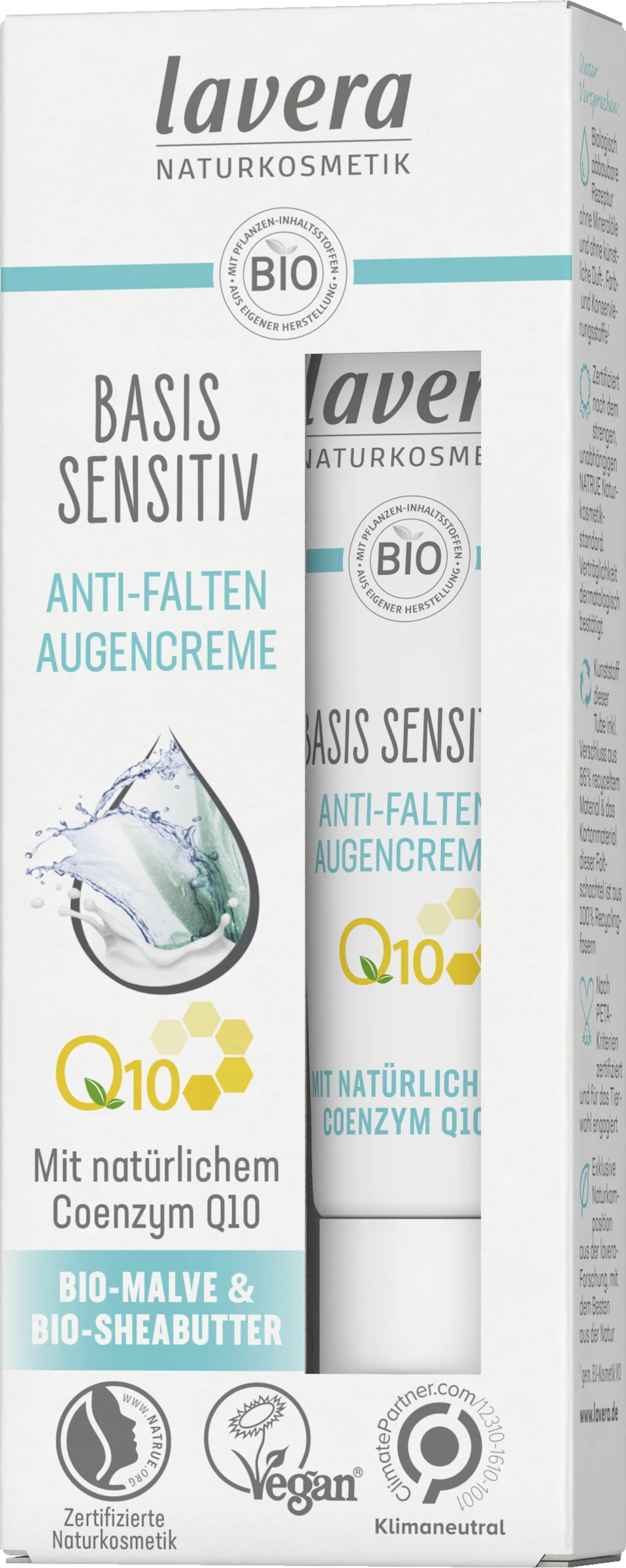 Erlebe das lavera Gefühl natürlich geglätteter Haut: Die basis sensitiv Anti-Falten Augencreme mit Bio-Malve & Bio-Sheabutter wirkt den Anzeichen von Hautalterung auf natürliche Weise entgegen. Die milde und gut verträgliche, parfümfreie Formel mit natürlichem Coenzym Q10 bekämpft dank antioxidativer Eigenschaften frühzeitige Hautalterung. Sie ist speziell auf die Bedürfnisse der sensiblen Augenpartie abgestimmt und glättet diese sanft. Die milde Pflegeformel für natürlich glattere Haut: