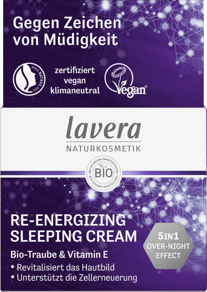 Erlebe das lavera Gefühl natürlich schöner Haut über Nacht: Während wir schlafen, arbeiten unsere Hautzellen auf Hochtouren, um die Spuren des Tages zu reparieren. Die Re-Energizing Sleeping Cream von lavera revitalisiert das Hautbild und unterstützt die natürliche Zellerneuerung in der Nacht. Die seidige Textur mit erlesenen Power-Wirkstoffen spendet der Haut intensive Feuchtigkeit – für eine frische und strahlend schöne Haut am Morgen.