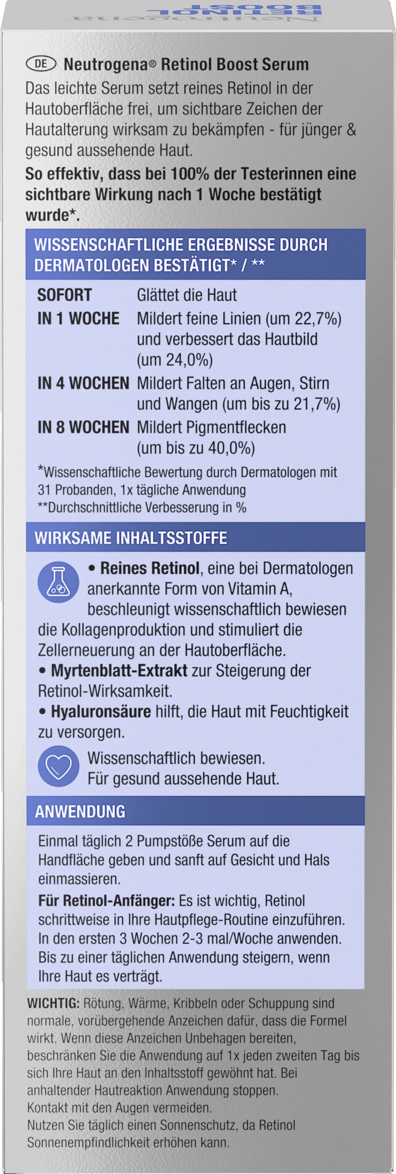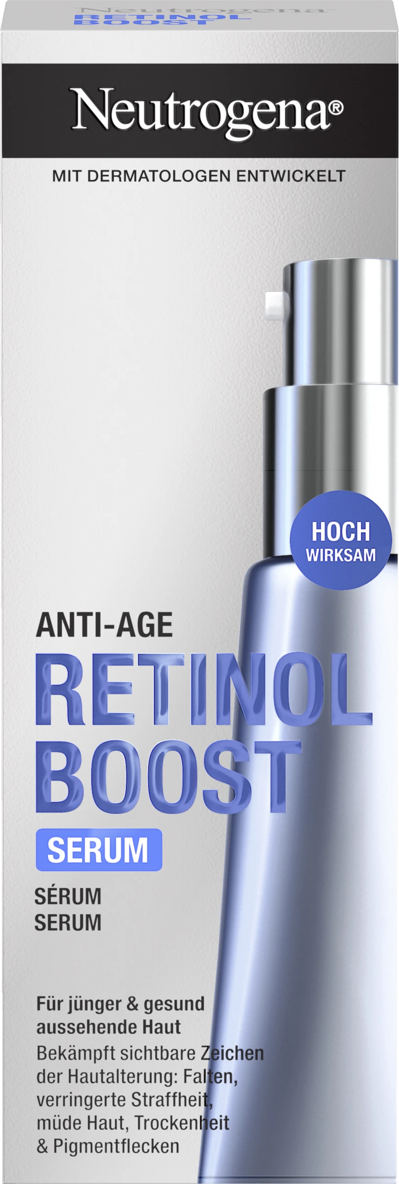 Das Neutrogena Retinol Boost Serum ist ein hoch wirksames AntiAge Gesichtsserum mit Retinol, Myrtenblatt-Extrakt & Hyaluronsäure und sorgt für jünger & gesund aussehende Haut. Das besondere Anti-Age Gesichtsserum bekämpft sichtbare Zeichen der Hautalterung: Falten, verringerte Straffheit, müde Haut, Trockenheit und Pigmentflecken. Zusätzlich verbessert das leichte Anti-Age Serum das Hautbild, sorgt für einen ebenmäßigen Hautton und glättet sofort die Haut. Die einzigartige Formel kombiniert reines Retinol zur Förderung der Kollagenproduktion, Myrtenblatt-Extrakt zur Steigerung der Retinol-Wirksamkeit und Hyaluronsäure für intensive Feuchtigkeit und pralle Haut. Das Anti-Age Serum für das Gesicht ist so effektiv, dass bei 100% der Testerinnen eine sichtbare Wirkung nach 1 Woche bestätigt wurde*.