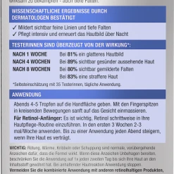 Kontakt mit den Augen vermeiden. Verwenden Sie einen Sonnenschutz, da Retinol die Sonnenempfindlichkeit erhöhen kann. Wichtig: Rötung, Wärme, Kribbeln oder Schuppung sind normale, vorübergehende Anzeichen dafür, dass die Formel wirkt. Wenn diese Anzeichen Unbehagen bereiten, beschränken Sie die Anwendung auf 1x jeden zweiten Tag bis sich Ihre Haut an den Inhaltsstoff gewöhnt hat. Bei anhaltender Hautreaktion Anwendung stoppen. Vermeiden Sie die kombinierte Anwendung mit anderen retinolhaltigen Produkten, die auf derselben Stelle angewendet werden.