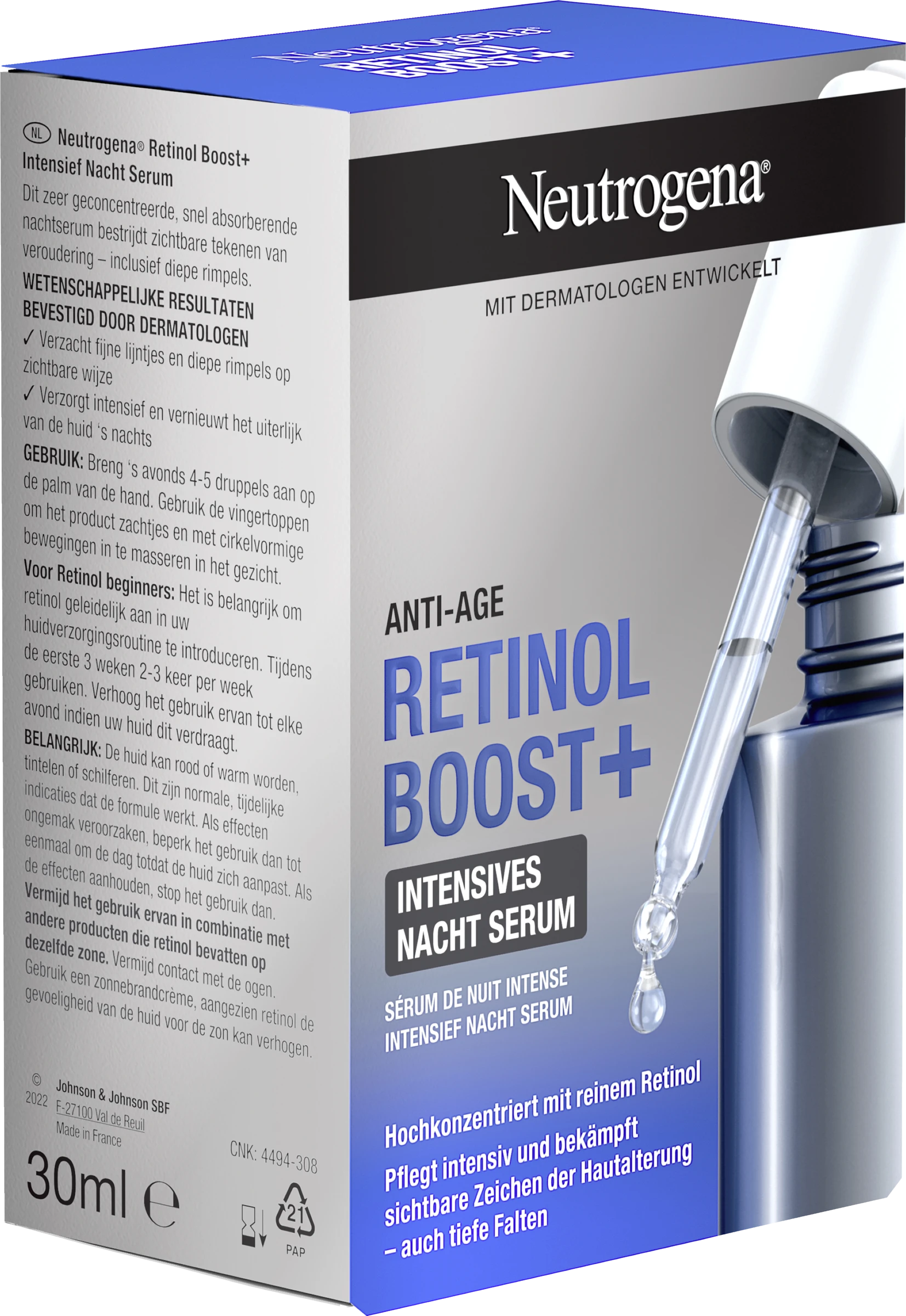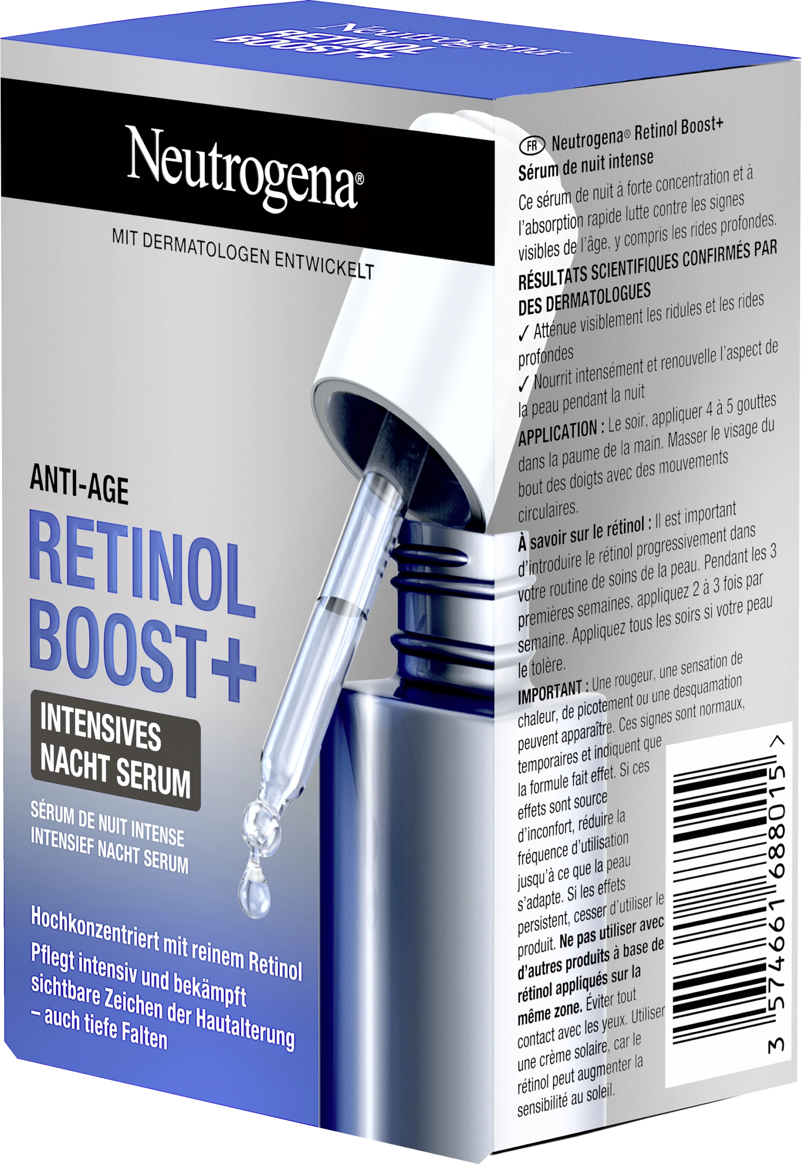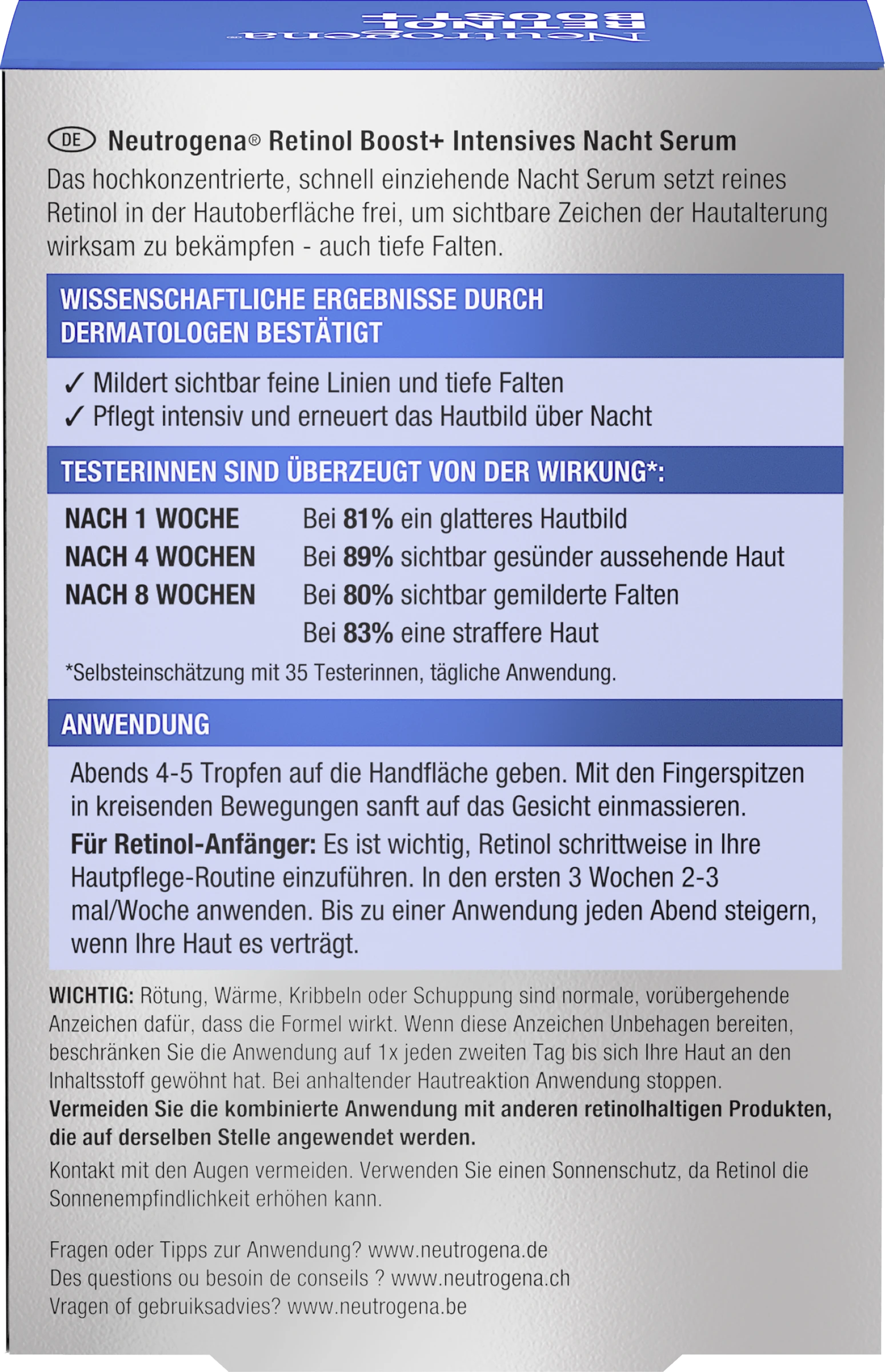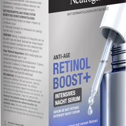 Das hochkonzentrierte und schnell einziehende Neutrogena Retinol Boost+ Intensives Nacht Serum pflegt das Gesicht intensiv und erneuert das Hautbild über Nacht. Zudem setzt das Anti-Age Gesichtsserum reines Retinol in der Hautoberfläche frei, beschleunigt wissenschaftlich bewiesen die Kollagenproduktion und bekämpft wirksam sichtbare Zeichen der Hautalterung. Zusätzlich mildert das schnell einziehende Gesichtspflege Serum auch tiefe Falten und stimuliert die Zellerneuerung an der Hautoberfläche. Die wissenschaftlichen Ergebnisse sind durch Dermatologen bestätigt.