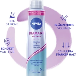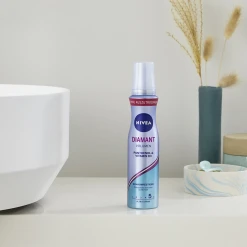 Der Schaumfestiger mit Panthenol und Vitamin B3 für Diamant Volumen pflegt das Haar beim Frisieren. Die leicht funkelnde Textur verleiht dem Haar schwerelose Fülle, Glanz und eine schöne Ausstrahlung. Der Haarschaum für Volumen und einen glamourösen Look: Diamant Volumen Schaumfestiger. Die Styling-Formel von NIVEA mit Panthenol und Vitamin B3 stärkt und schützt das Haar. Ohne auszutrocknen – einfach schön gestyltes Haar.