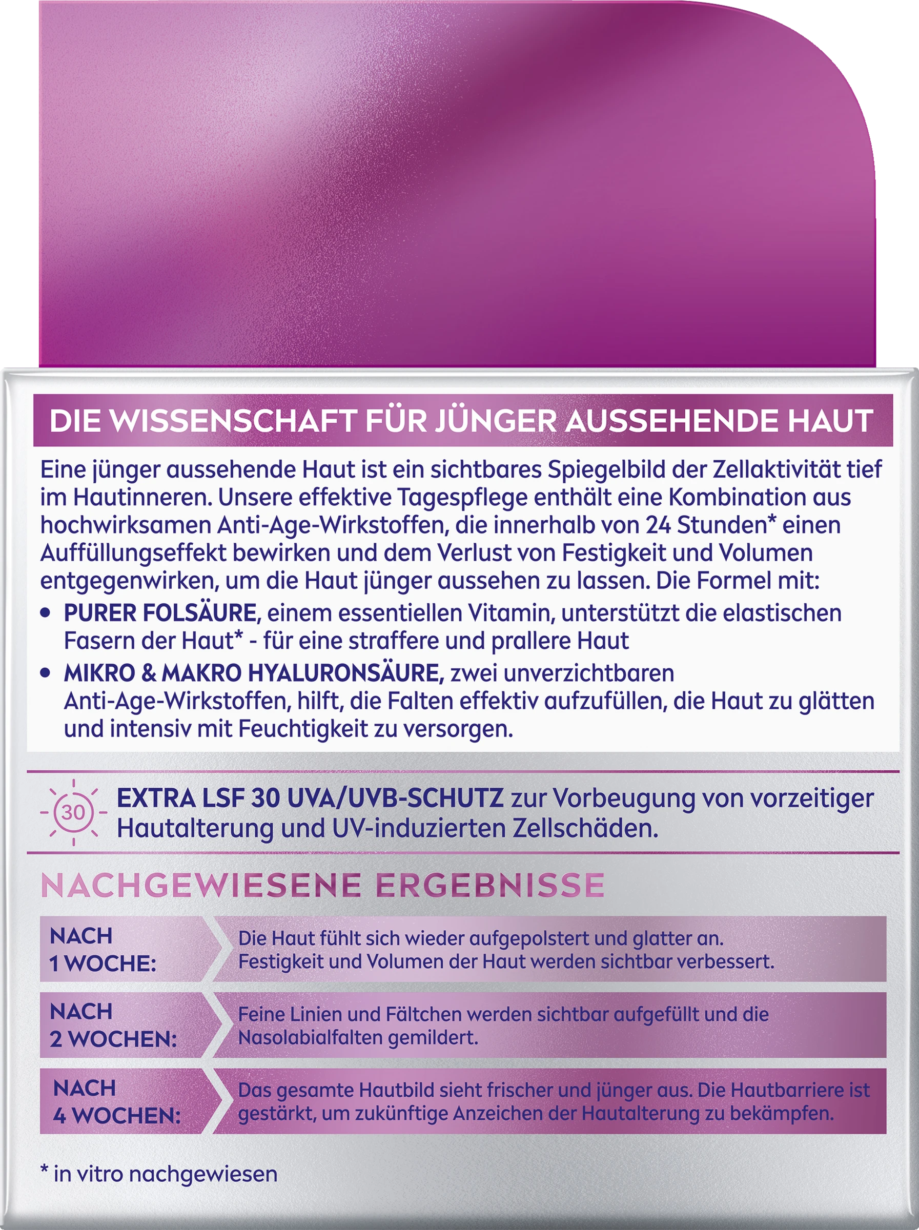 NIVEA Cellular Expert Filler Hochwirksame Anti-Age Tagespflege LSF 30 mit ihrer innovativen Formel enthält eine Kombination aus hochwirksamen Anti-Age Wirkstoffen, die innerhalb von 24 Stunden* einen Auffüllungseffekt bewirken und dem Verlust von Festigkeit und Volumen entgegenwirken, um die Haut jünger aussehen zu lassen.