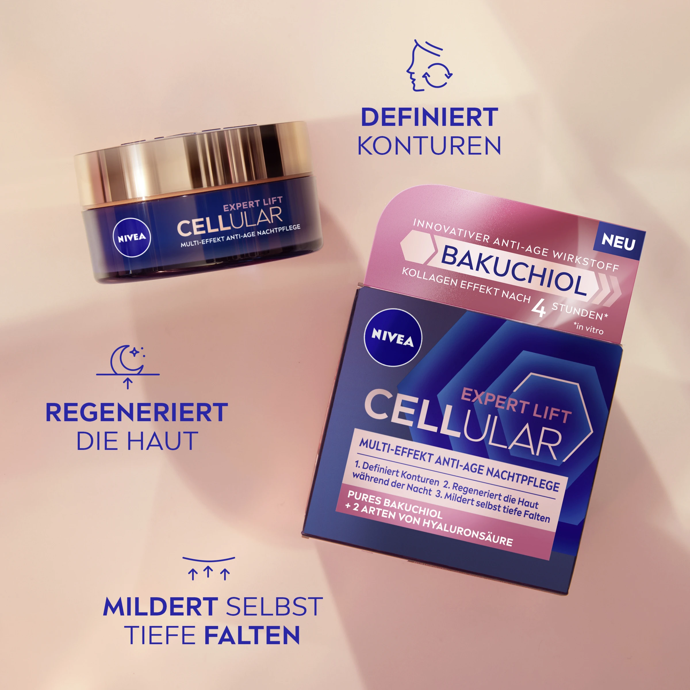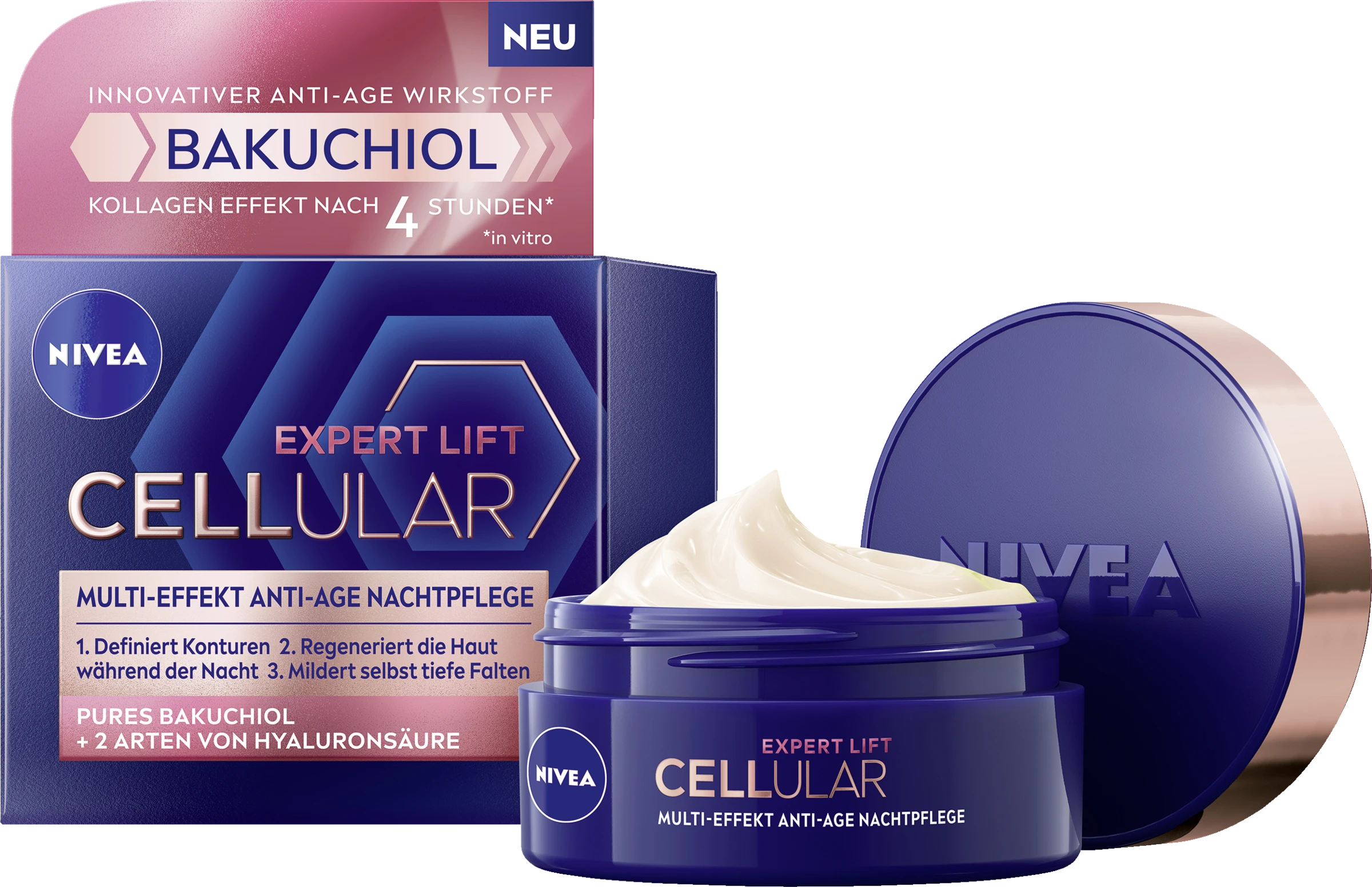 Die Cellular Expert Lift Multi-Effekt Anti-Age Nachtpflege – mit Bakuchiol als Alternative zu Retinol – ist die ideale Anti Age Nachtcreme für jünger aussehende Haut. Unsere innovative Formel erhöht die Zellaktivität tief im Hautinneren & hilft die Haut zu festigen.* Pures Bakuchiol, eine neue Anti-Age Wirkstoffgeneration bei NIVEA & Hyaluronsäure unterstützen die Kollagenproduktion bereits ab 4h nach der Anwendung. Sie versorgen die Haut mit intensiver Feuchtigkeit, glätten sie & mildern Falten sichtbar.