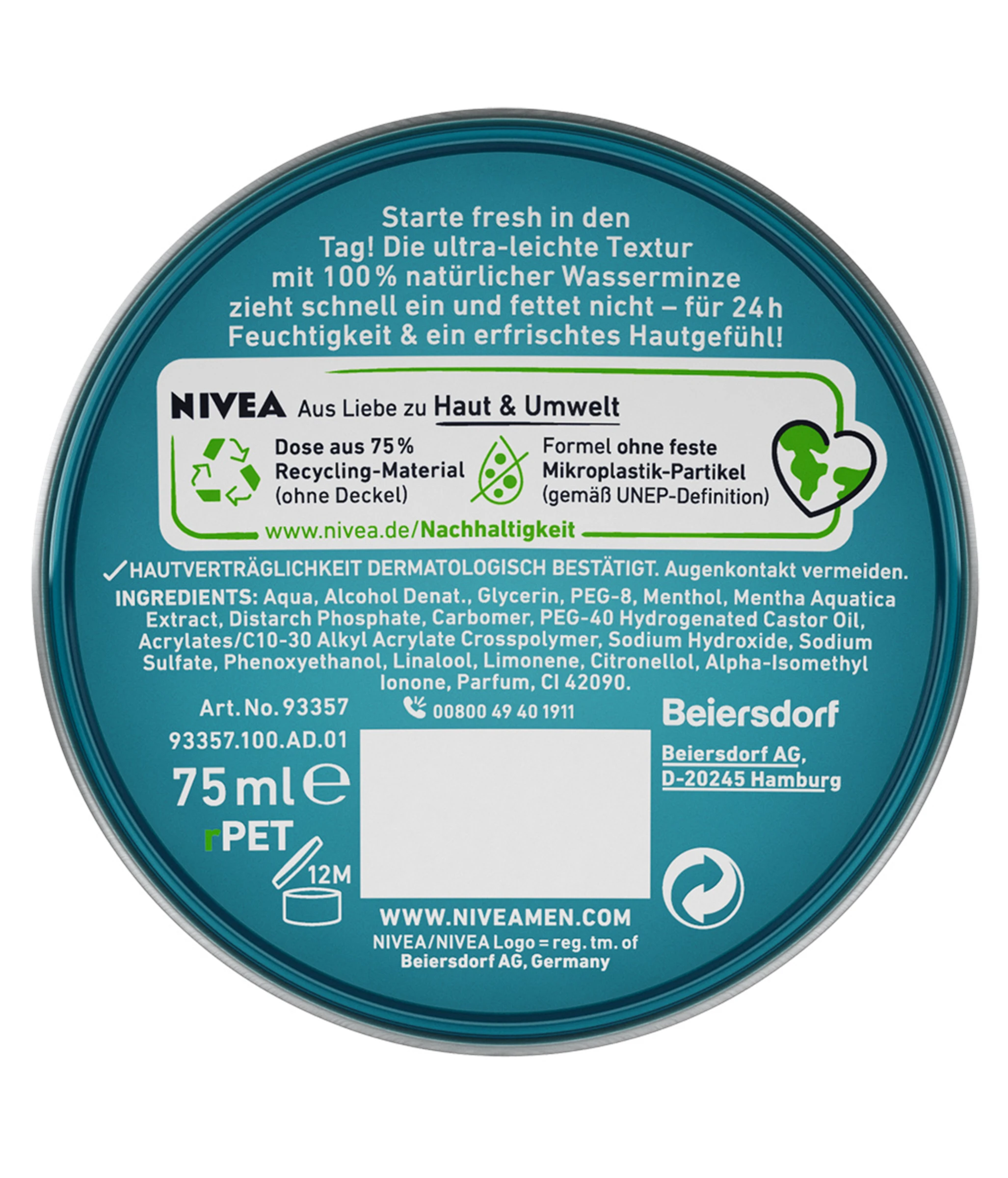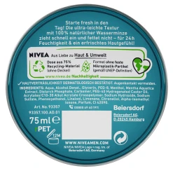 Das ACTIVE ENERGY HYDRO GESICHTSGEL FRESH von NIVEA MEN erfrischt die Haut sofort und versorgt sie 24 Stunden mit Feuchtigkeit. Die Formel ist angereichert mit 100% natürlicher Wasserminze und zieht sofort ein – ganz ohne zu fetten. Die ultra-leichte Textur lässt sich leicht verteilen und ist frei von Mikroplastik-Partikeln. Das Design der Dose wurde speziell für Männer entwickelt und durch die Verwendung von 75% recyceltem Plastik schont die Verpackung auch die Umwelt.
