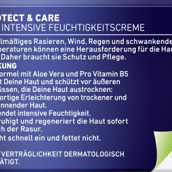Regelmäßiges Rasieren, Wind, Regen und schwankende Temperaturen können eine Herausforderung für die Haut sein. Daher braucht sie Schutz und Pflege. Die reichhaltige Feuchtigkeitscreme mit Aloe Vera und ProVitamin B5 pflegt die Haut intensiv und schützt sie vor dem Austrocknen.