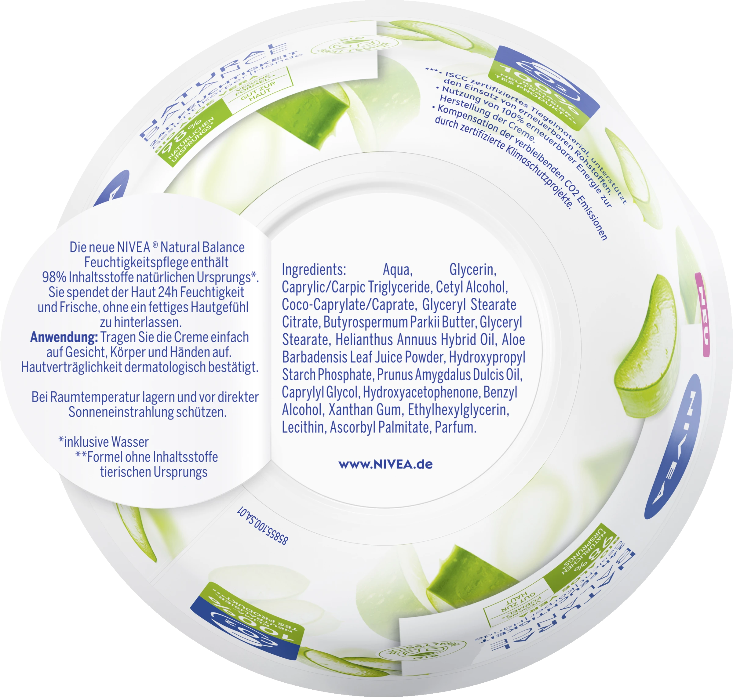 Natürliche Inhaltsstoffe, ein verantwortungsbewusster und nachhaltiger Lebensstil – wir achten heutzutage immer mehr darauf, etwas Gutes für uns und unsere Umwelt zu tun. Das sollten wir bei unserer Hautpflege nicht vernachlässigen. Inspiriert von der Kraft der Natur enthält die neue NIVEA Natural Balance Aloe Vera Creme Inhaltsstoffe 98% natürlichen Ursprungs*. Die nachhaltige Verpackung der Natural Balance Aloe Vera Creme ist vollständig recyclebar und besteht aus 100% nachwachsenden Rohstoffen. Aus Liebe zu Haut & Umwelt: NIVEA Natural Balance Aloe Vera Body Lotion.