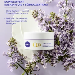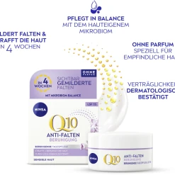 Die Q10 POWER ANTI-FALTEN + STRAFFUNG Tagespflege für sensible Haut mit 100% HAUTIDENTISCHEM Q10 mildert Falten sichtbar. Die sanfte Formel ist speziell für die Bedürfnisse sensibler Haut entwickelt und frei von Parfum und Ethyl Alkohol: Q10 POWER Anti-Falten + Beruhigung Tagespflege Sensitiv.