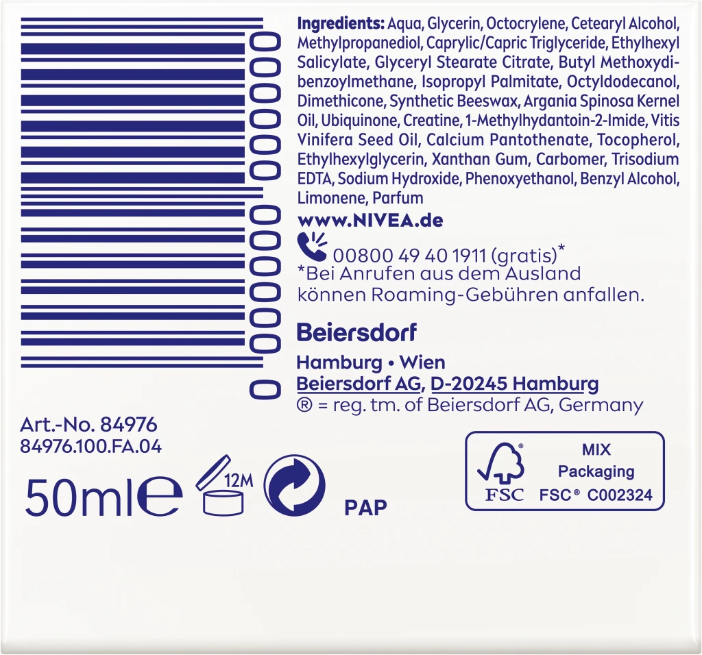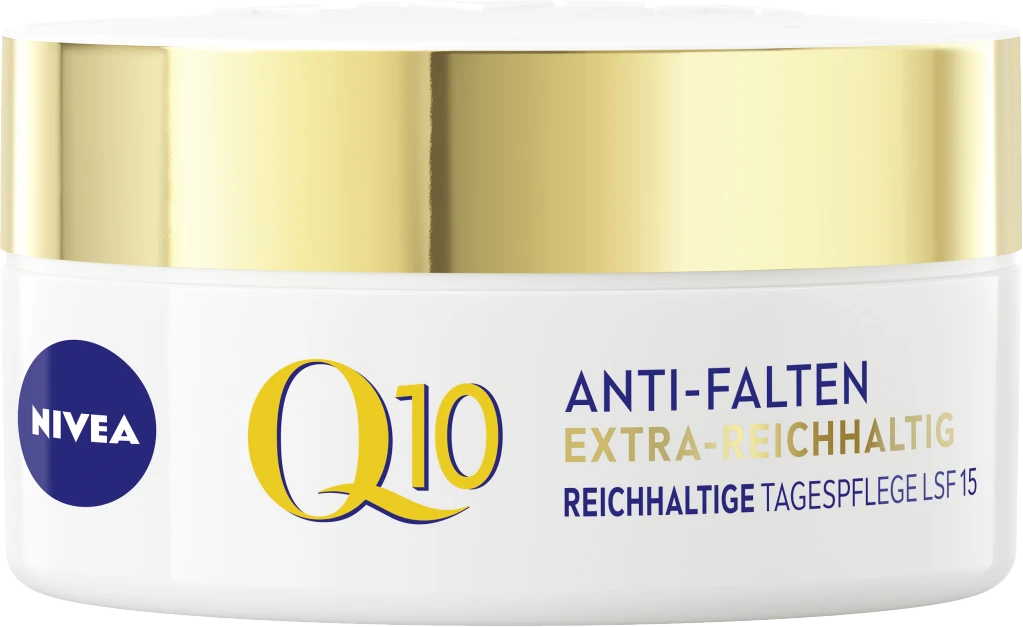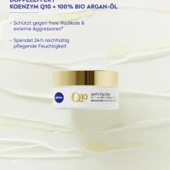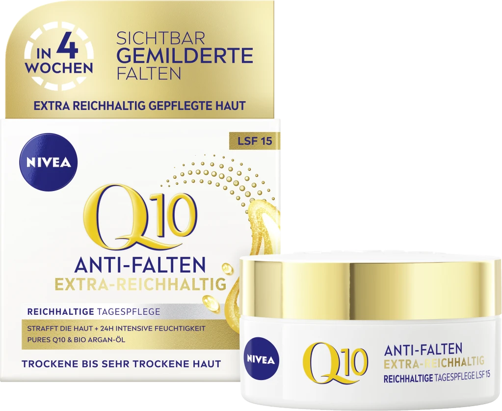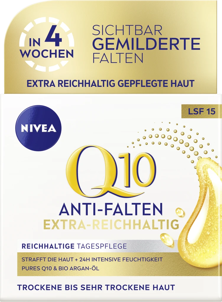 Die NIVEA Q10 POWER +EXTRA REICHHALTIG Tagespflege für trockene bis sehr trockene Haut versorgt die Haut den ganzen Tag über intensiv mit Feuchtigkeit und reichhaltiger Pflege. Wertvolles Bio Argan-Öl sorgt dabei für ein angenehmes Hautgefühl. Außerdem enthält NIVEA Q10 POWER 100% hautidentisches Q10. Als schützendes Anti-Oxidans bekämpft es den natürlichen Alterungsprozess der Haut. Die Formel reduziert Anzeichen der Hautalterung: Falten werden nach 4 Wochen sichtbar gemildert und die Haut bereits nach 2 Wochen gestrafft. Die mit Argan-Öl angereicherte, aber nicht-fettende Tagespflege wurde speziell für trockene bis sehr trockene Haut formuliert und spendet der Haut 24 Stunden Feuchtigkeit.