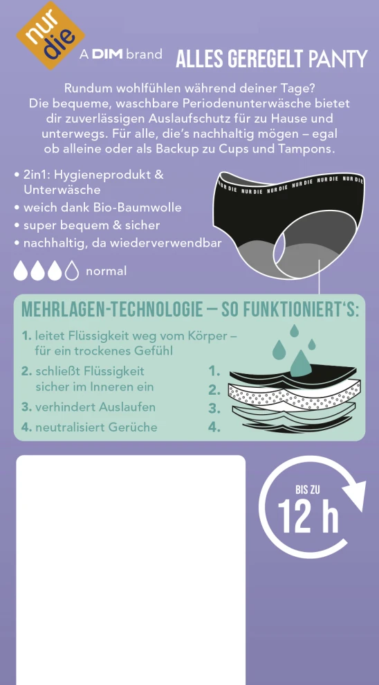 Alles geregelt Panty. Rundum wohlfühlen während deiner Tage? Die bequeme, waschbare Periodenunterwäsche bietet dir zuverlässigen Auslaufschutz für zu Hause und unterwegs. Für alle, die´s nachhaltig mögen – egal ob alleine oder als Backup zu Cups und Tampons.